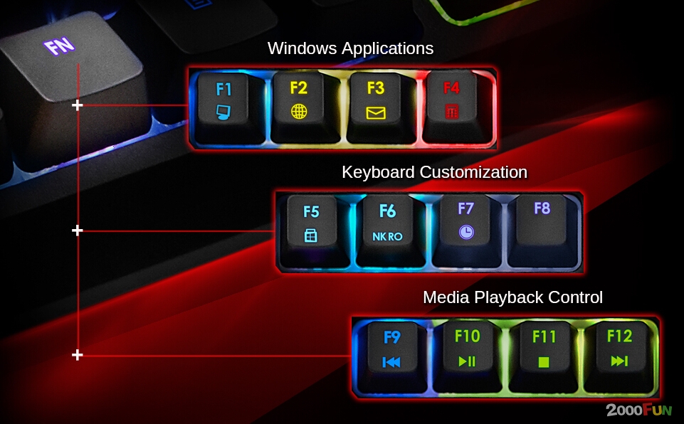 KM570 RGB內建FN快捷複合鍵功能,不管是應用程式、背光亮度、多媒體控制或者其他功能,皆可以透過簡單的兩指操作輕鬆完成各種鍵盤配置。