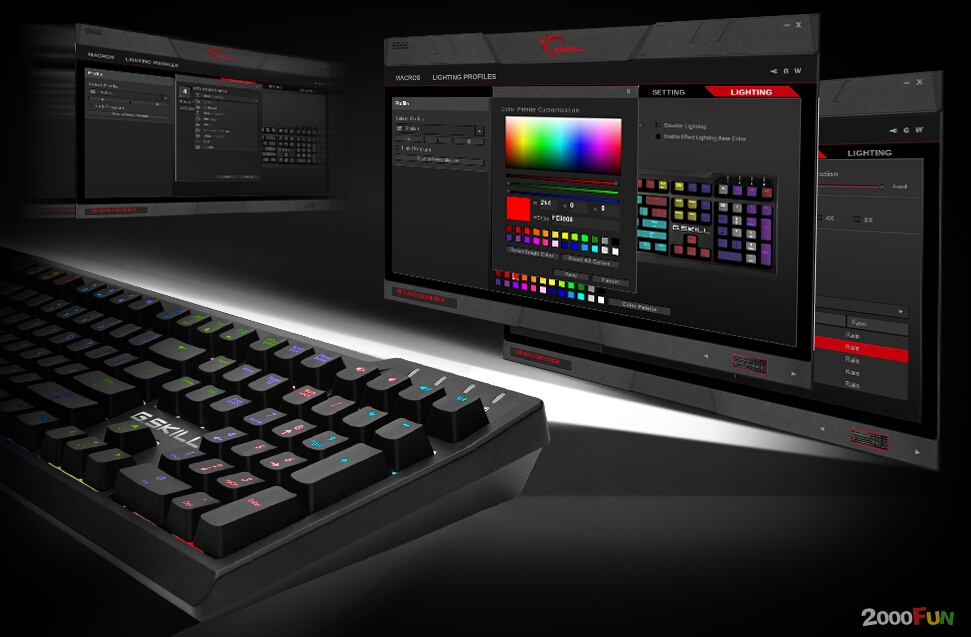 透過強大的 G.SKILL 控制軟體,無論是按鍵功能、巨集鍵設定、燈光效果,整合式的系統介面讓玩家能以直覺化的操作,調整出最適合自己的鍵盤設定,而多組自由編輯的模式設定,更方便玩家根據遊戲戰況,切換不同預先設置的戰鬥風格。