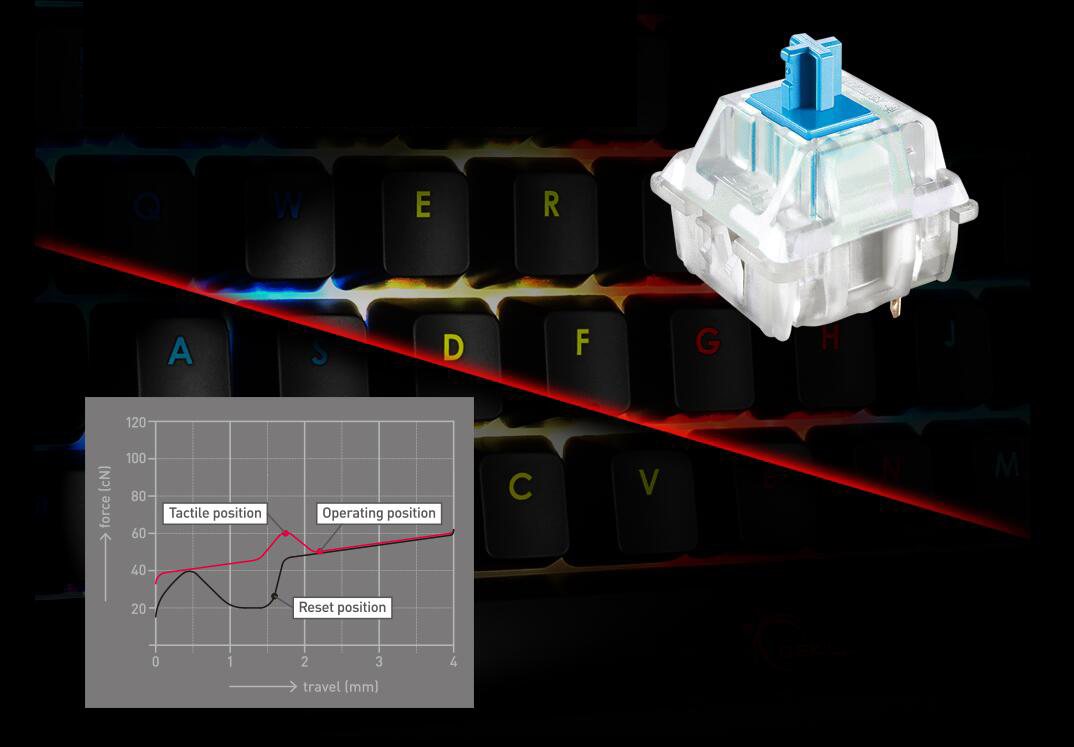 採用Cherry MX RGB全彩背光機械鍵軸,高耐用度讓每一顆鍵軸皆能承受高達5000萬的敲擊次數,2mm的低觸發鍵程更能讓您在遊戲對戰中能以低延遲準確快速執行各種戰術。Cherry青軸有著強烈的段落感,清脆俐落的敲擊回饋將帶給您爽快的鍵盤體驗。