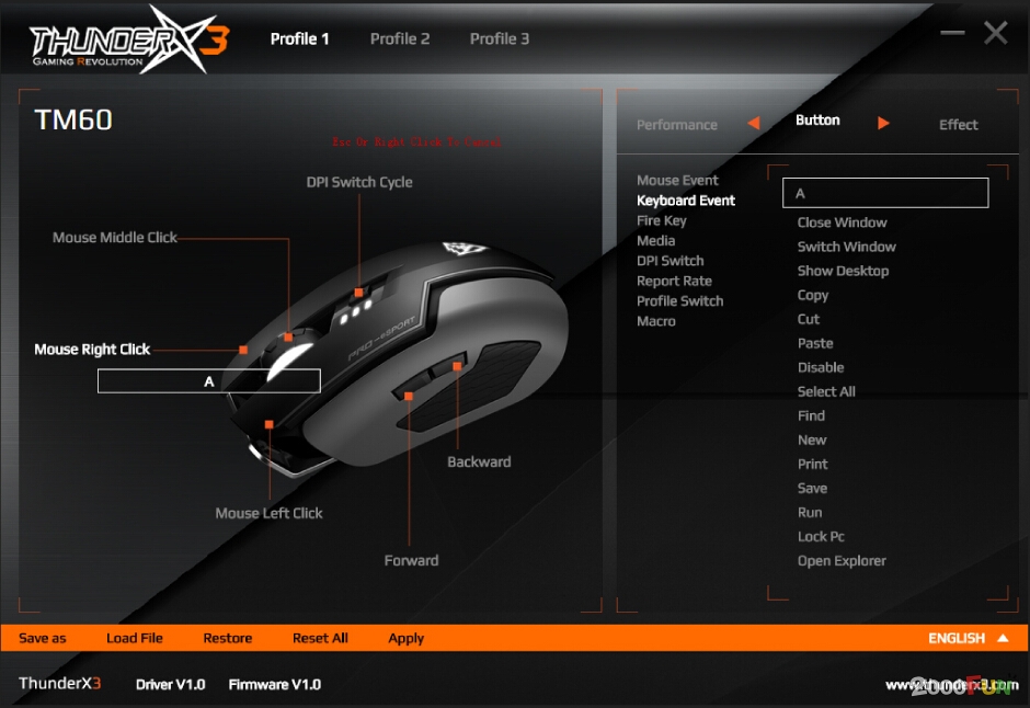 TM60 內建 Avago-9800 鐳射感應器, 設有應用軟件給用家進行微調,為用家提供專業微調功能 ( 50 - 16000 DPI 值 ) ,最高達至 16,000 DPI 能於大型屏幕上發揮所長,移動鼠標時更得心應手。至於最低 50DPI 值適合即時切換至狙擊模式,玩家作為狙擊手時精準瞄準獵物時大派用場。