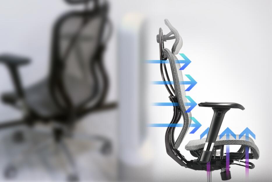 有別於其他網椅,T05顧慮到座椅後方放置風扇、空調的情境,而精心打造的骨架,除了擁有堅固的結構,也能讓吹往各部的風流不受阻擋,使濕氣與熱氣快速消散。