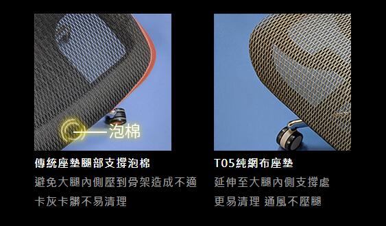 有別於市面上半皮革半網、腿部需要額外泡棉支撐的網椅,T05在椅面不惜成本,全面採用高彈力進口Matrex尼龍網布,通過美國加州117技術公報耐燃測試,與英國BS5852防火測試標準,提供最安全舒適也最易清潔維護的乘坐方案。