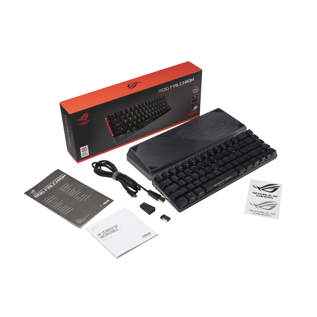 ROG Falchion 65% 無線機械式電競鍵盤搭載 68 鍵,具備無線 Aura Sync 燈效、互動式觸控板、鍵盤保護蓋、Cherry MX 鍵軸,以及長達 450 小時的電池續航力