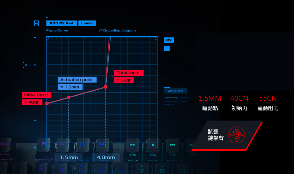 ROG RX 光學機械紅軸是 ROG 首款自製軸。經過大量研究、測試與調校,達到 1.5mm 驅動點以提供光速般輸入速度。40 g 的初始力可防止意外的觸發,55g 驅動阻力則可提供完美的回饋。ROG RX 紅軸提供流暢線性觸感,在你按下按鍵時提供近乎瞬時的回饋。了解更多