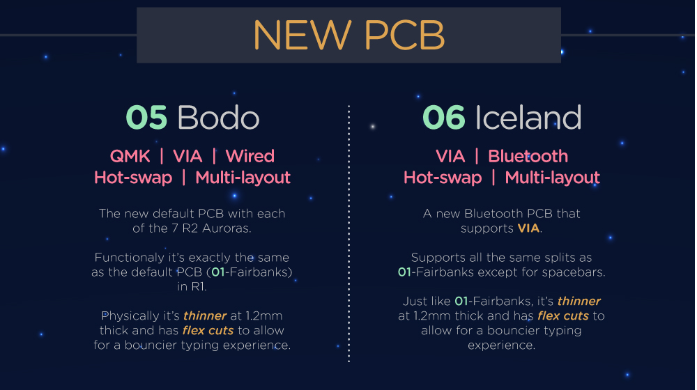 無線默認PCB(Iceland 06)在R2進行了更新,採用1.2mmPCB,可以導入Json以使用VIA進行鍵盤功能調整,同時,可讓您隨時隨地使用拆分L Shift,拆分R Shift,階梯式大寫鎖定和ISO Enter中的任何一個或全部,同樣無需焊接!