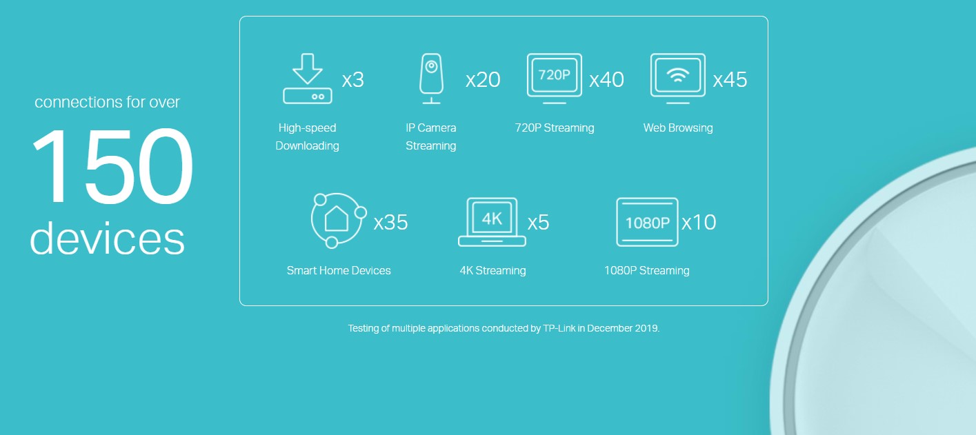 Enjoy a more efficient network with 4× the average throughput on connected devices in dense environments thanks to Wi-Fi 6 technology. Deco X20 is tested to connect over 150 devices without dragging down performance.