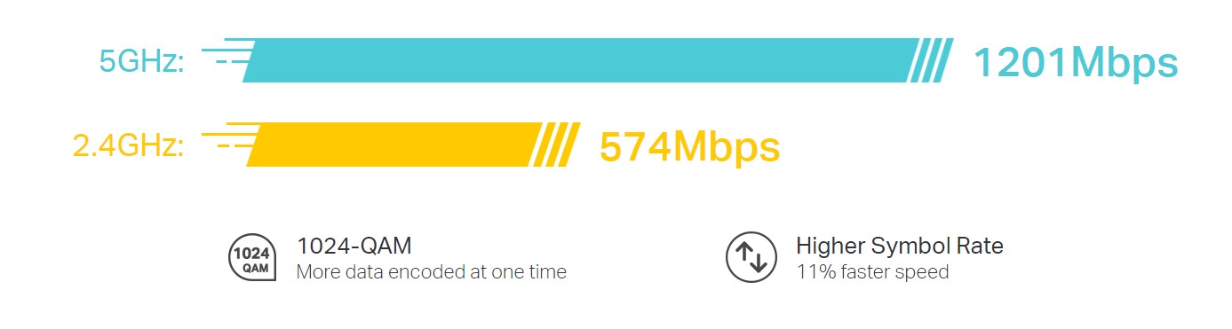• Faster Connections: Wi-Fi 6 speeds up to 1,800 Mbps—1,201 Mbps on 5 GHz and 574 Mbps on 2.4 GHz.