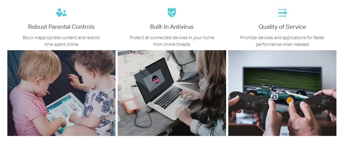 • Total Security: WPA3 encryption and TP-Link HomeCareTM provide personalized features, including Parental Controls, Antivirus, and Quality of Service (QoS) to ensure a safer online experience.