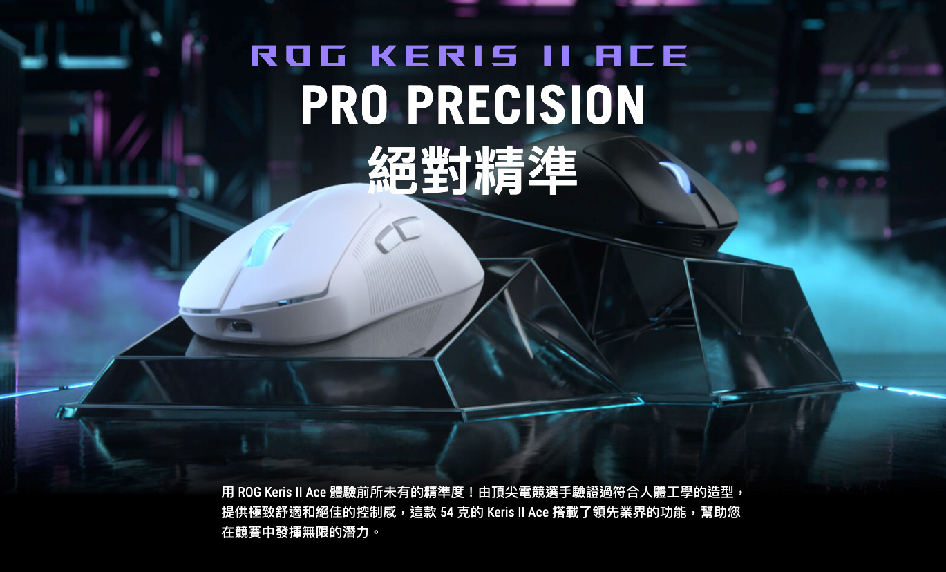 ROG Keris II Ace 是一款超輕量的 54 克人體工學電競滑鼠,其外型經過專業的 FPS 玩家測試和認可。