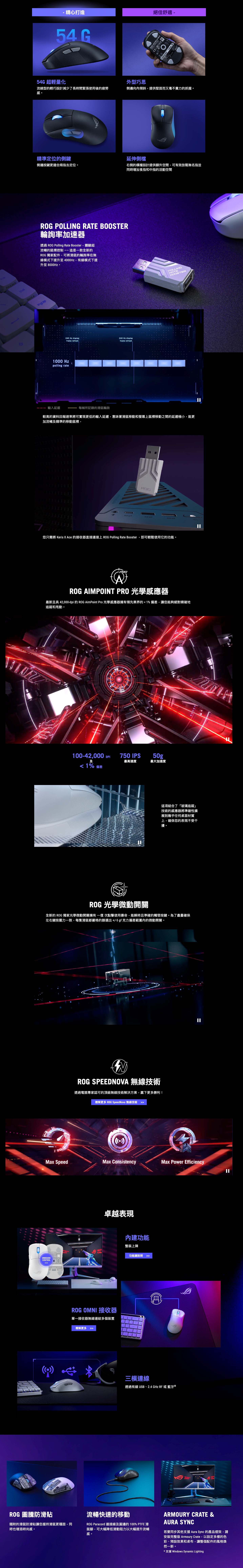 - ROG AimPoint Pro 光學感應器: 42,000 dpi的光學感應器,< 1% 的偏差,極致精確,可於玻璃上滑動