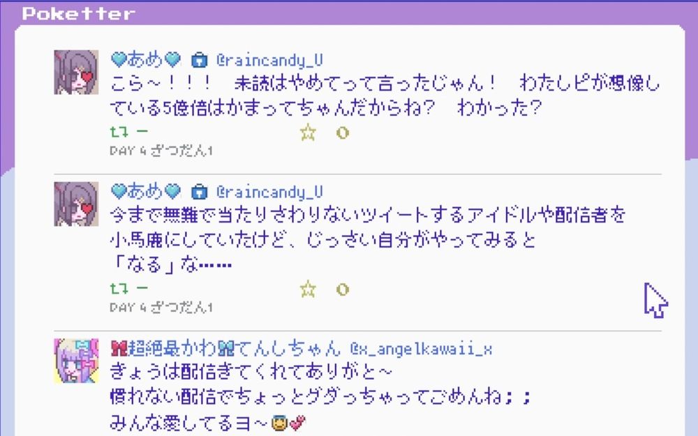 • 提供每日評論和指導,幫助將 Ame 培養成頂級主播, 這樣她就可以從樂於捐款的御宅族粉絲中榨取大量超級留言。