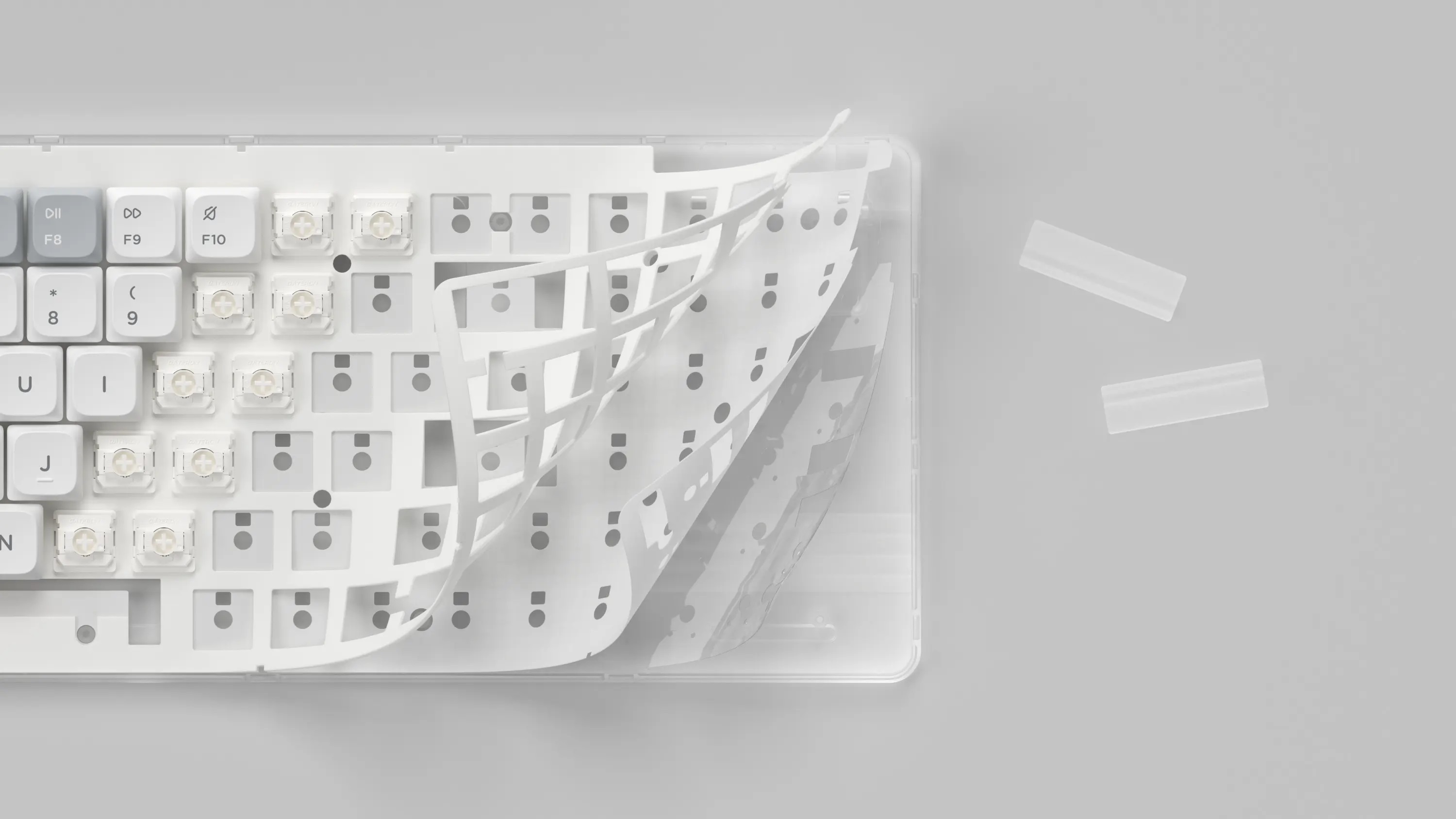 Structure-borne sound engineering, increasingly recognized as vital to overall keyboard sound performance, is still almost unused among low profile keyboards outside of the original Air96. The new Air96 V2 makes strides in sound concentration and purity upon the original’s successful plate poron hollow-sound absorption and PCB IXPE sound purification solution, by placing an extra layer of PET sound pad between the poron foam and the switch pad. Additional attention is given to tune the spacebar in harmony with the rest of the keys, using silicone sound shaping tech derived from our acclaimed GhostBar.