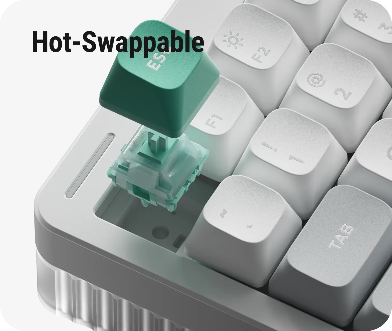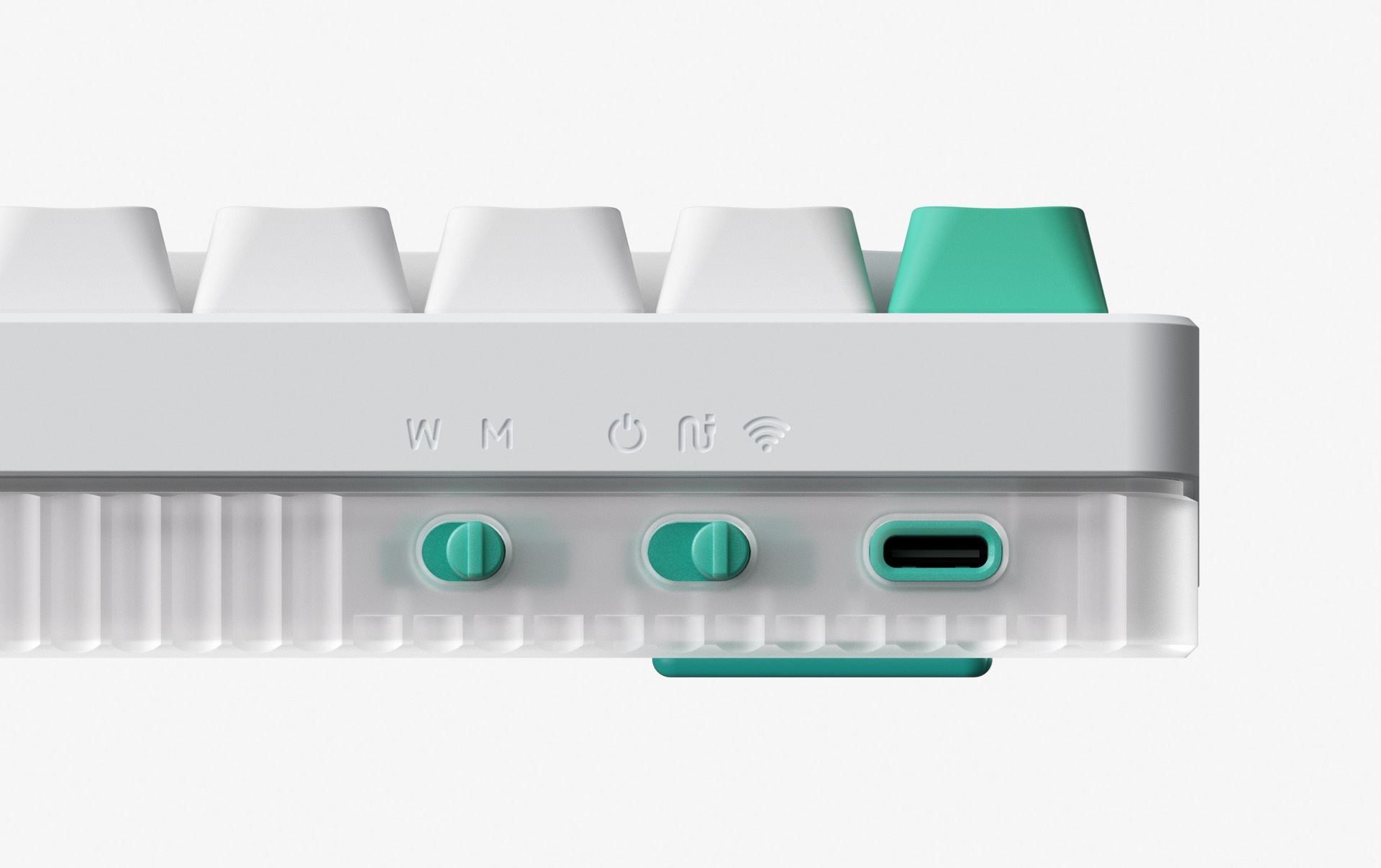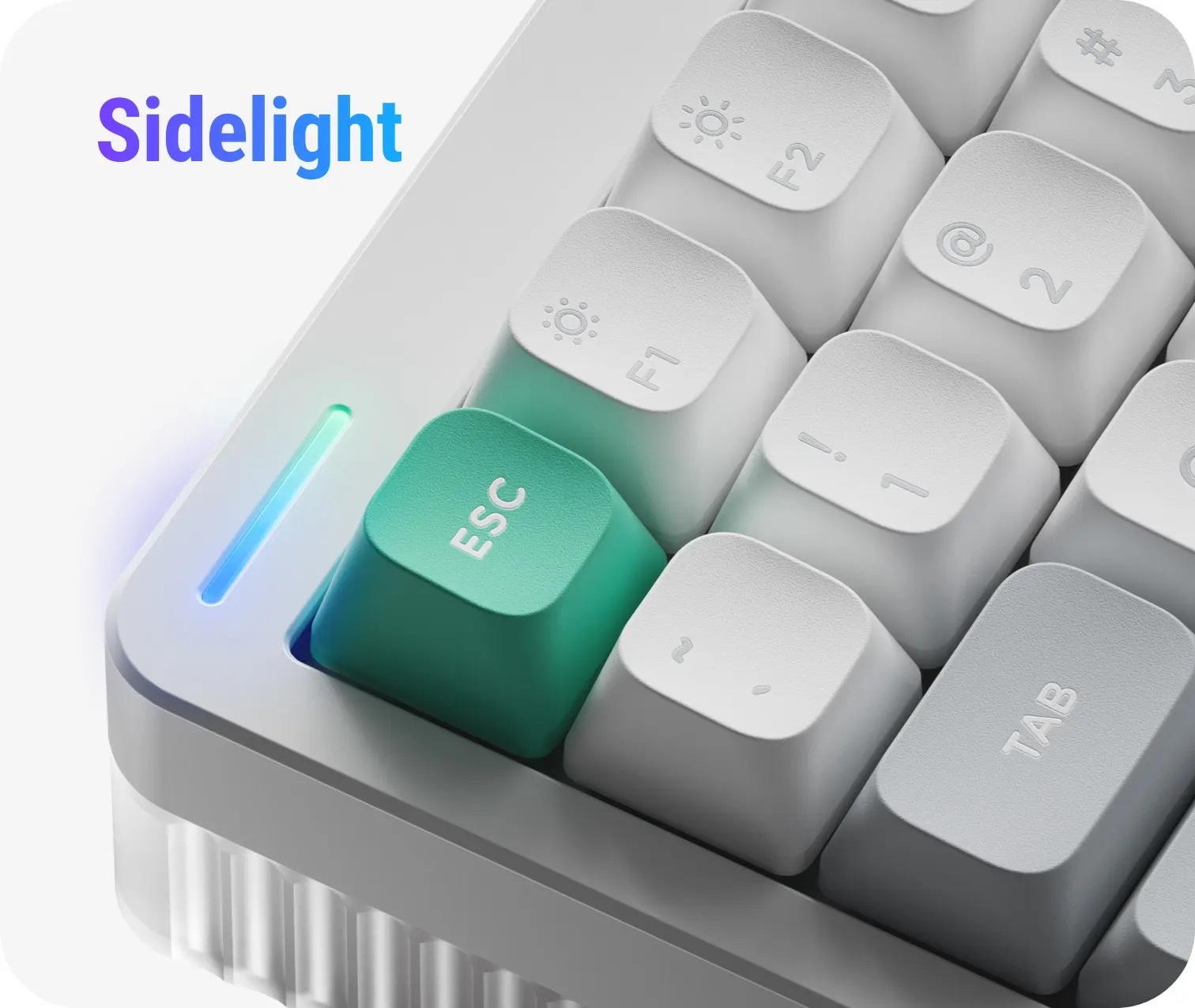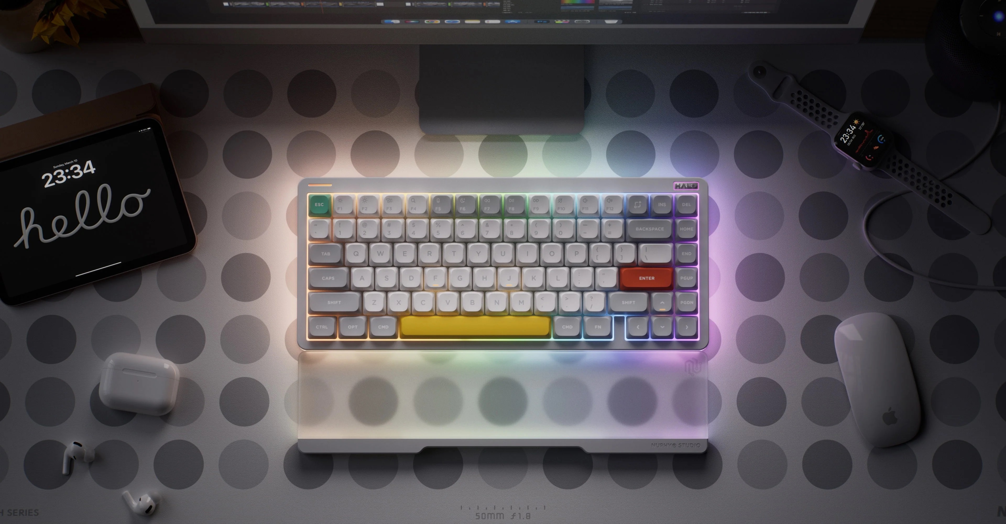 If there ever was a market segment Halo positions itself in, it is being both a device that can handle every task you throw at it, and an absolute gorgeous looker. Its wavy side columns, solid unibody aluminum frame, and its unabashed light maximalism, all serve to enhance this role. In the design of the V2 we have only doubled down on the investment: the completely redesigned semi-transparent bottom case extends the layer-ness of the Ionic side columns into the third dimension, while the Gem-style nameplate LED brings a fun twist to Halo’s impressive lineup of functional lights. When the lights go on, the bottom case ‘merges’ into the Halo light bands to create the most amazing light effects ever seen on a NuPhy keyboard.