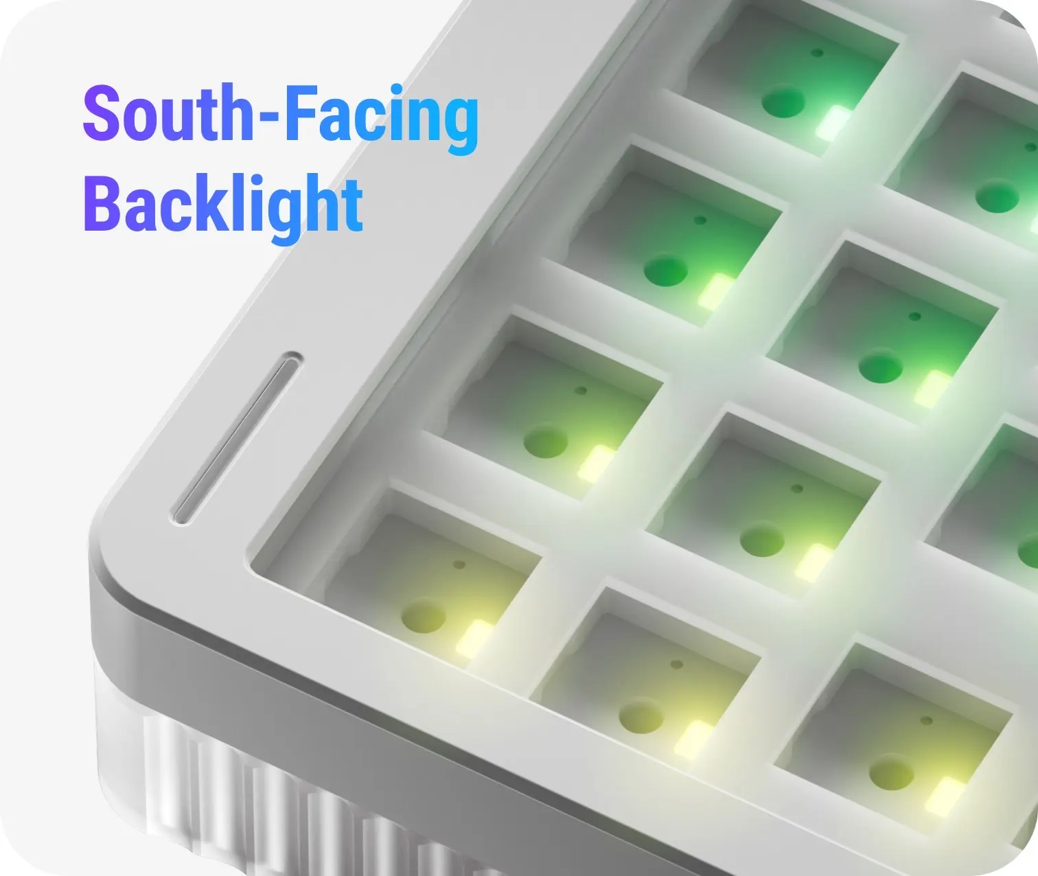 Finding your way home with the lights. Built with a triple shot injection process, NuPhy's proprietary light-emitting homing bars exploits the south-facing nature of the switches for the illumination, which helps you finding them at much extended ranges. The built-in power saving feature ensures that you will not see in the battery life the immediate difference in the way you interact with the keyboard.
