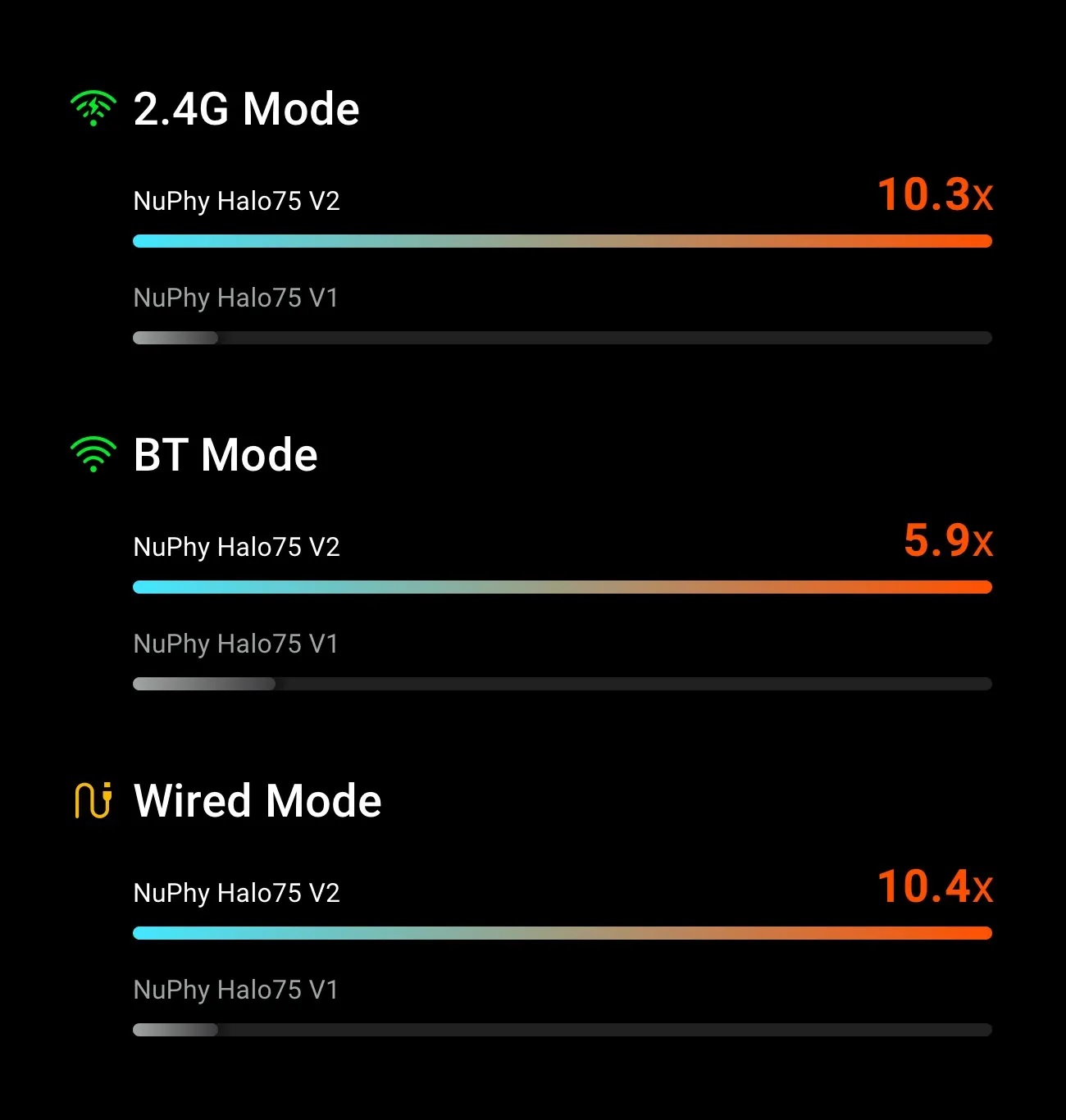 We have taken our latency minimization game to a new level on Halo75 V2. Through the combined effort of an state of the art 1000Hz 2.4G SoC and optimization/testing done by our engineers, Halo users can now access the wired-like, pro-gaming level wireless performance on their already OP keyboards.