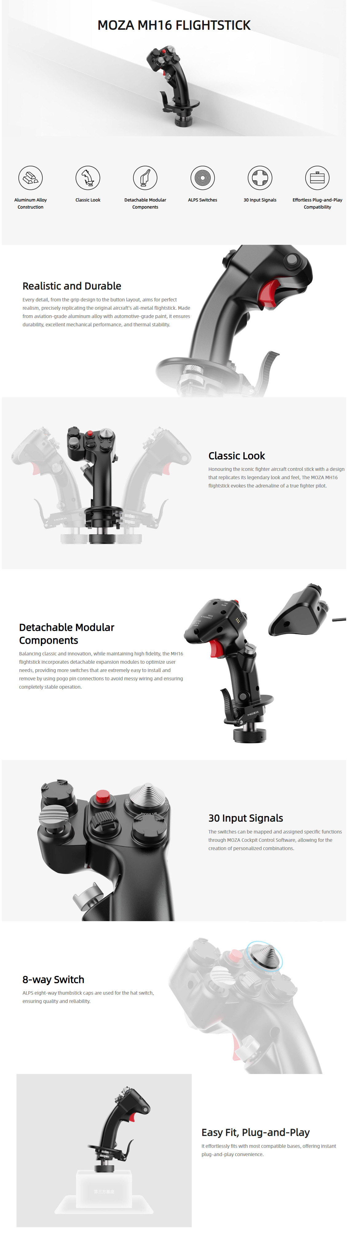 MOZA MH16 飛行操縱桿由航空級鋁合金和汽車級油漆製成,具有卓越的耐用性和經典的戰鬥機設計。