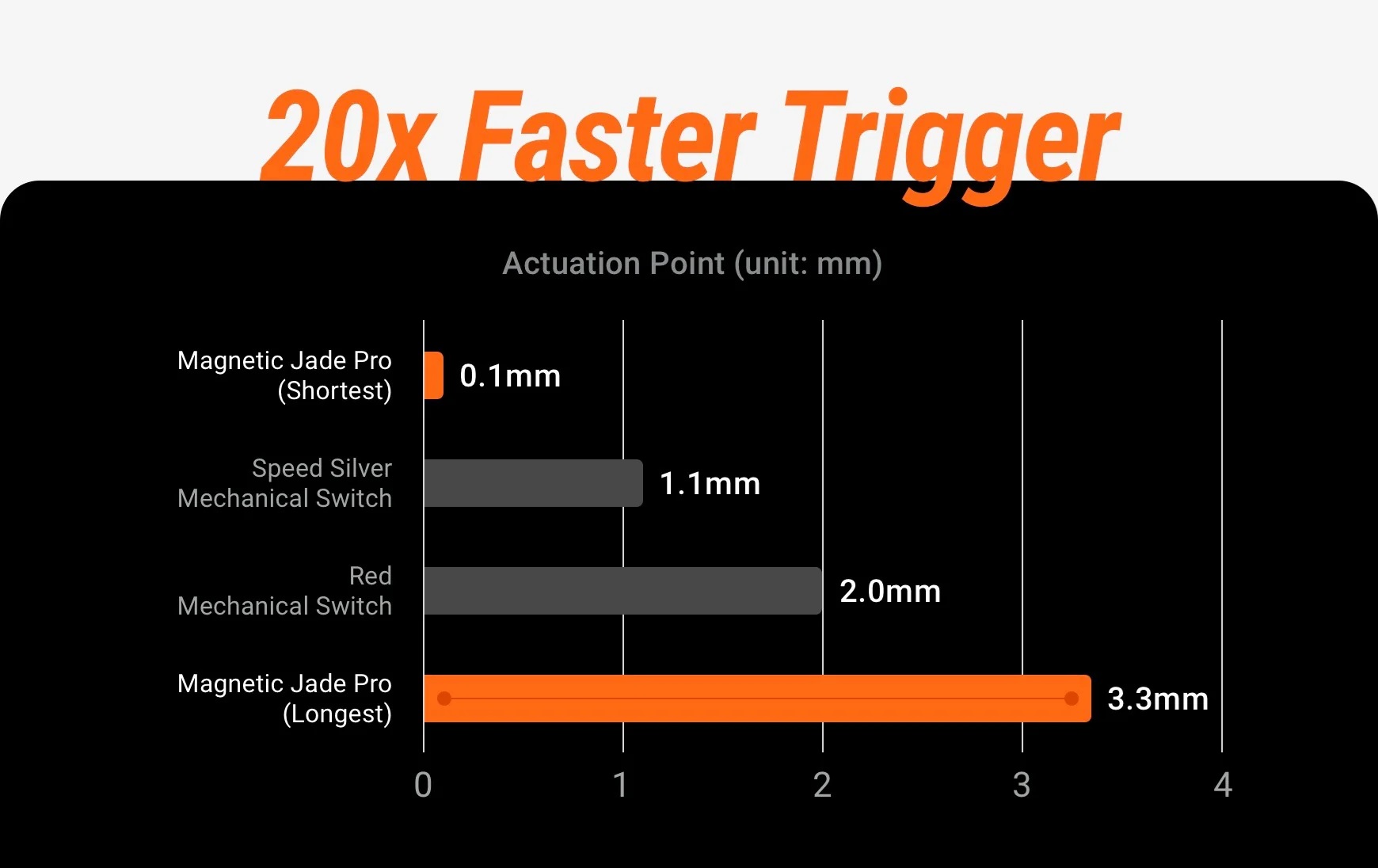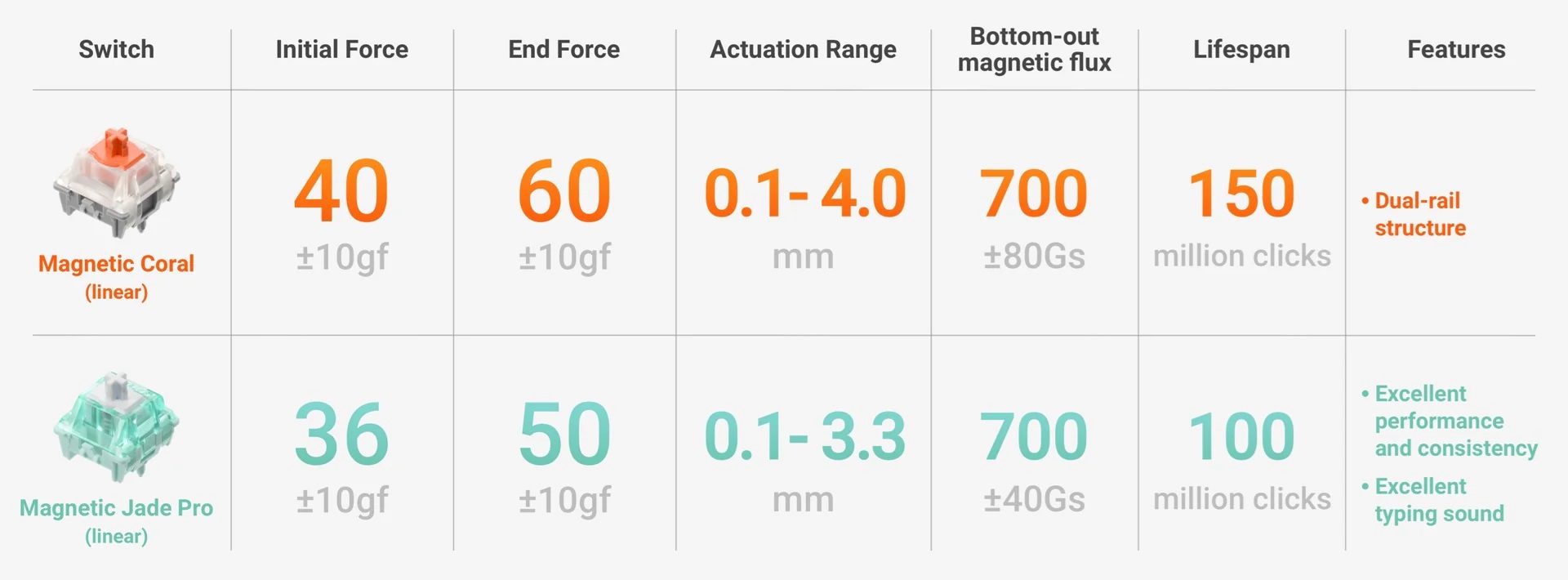 * The actuation point for the Magnetic Jade Pro can be freely set between 0.1mm and 3.3mm, while the Magnetic Coral offers a range from 0.1mm to 4.0mm.