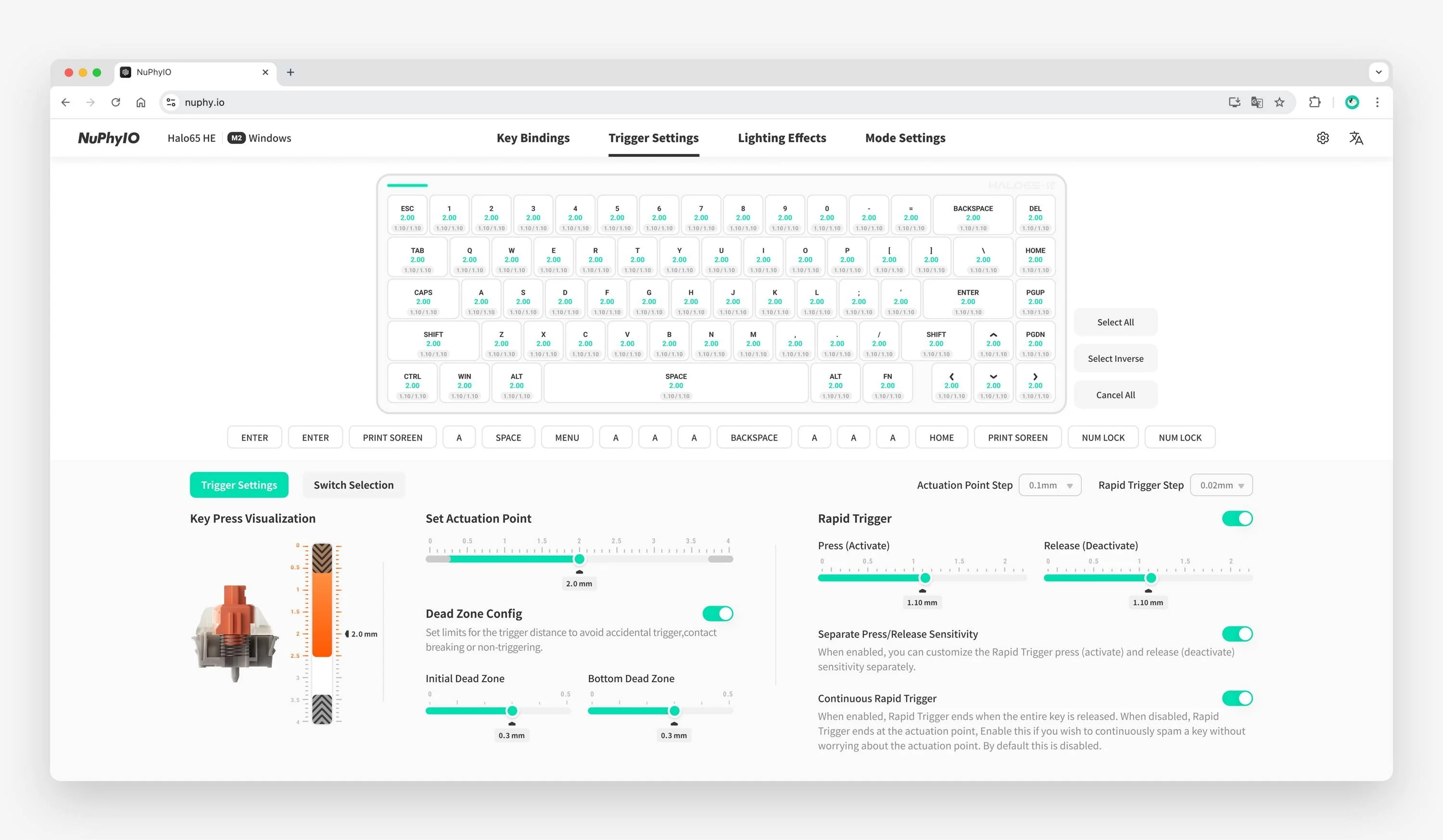 Settings and parameters editing are vital to the magnetic switch keyboard user experience. Through a new interactive design approach, NuPhyIO aims to make this unwieldy task more accessible for casual and experienced users alike. Every single parameter affecting the system performance is tweakable, and the tweaks are visible in the UI in real-time as they take effects, such as the per-key rapid-trigger/sensitivity annotations on the keyboard preview.