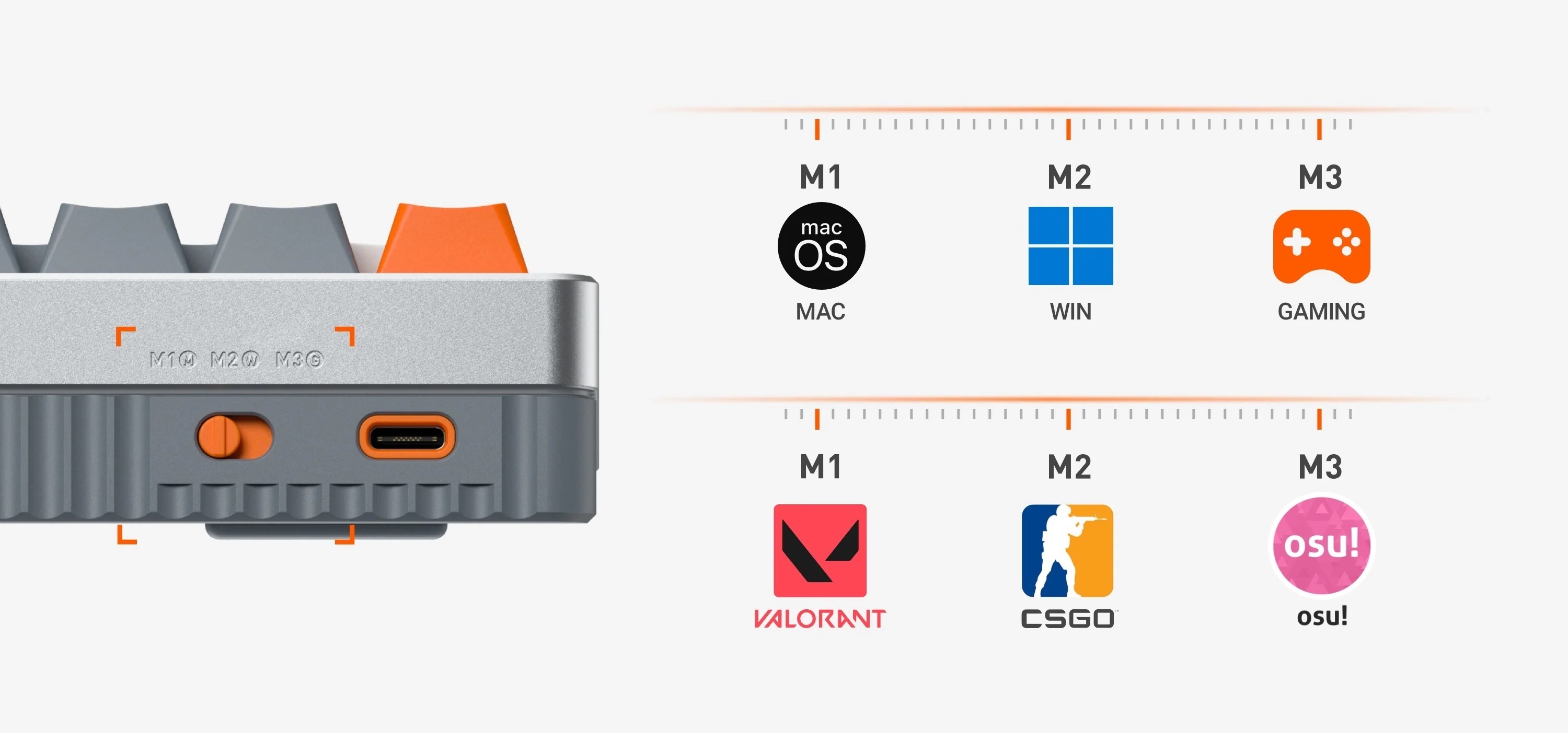Introducing RapidSwitch. A complete overhaul of the mode on earlier NuPhy keyboards that provides integration and organization of all data associated with a user role, such as layers, lighting, travel distance & sensitivity. You can have different modes for different OSes, or different games, and they can all be selected by the redesigned RapidSwitch. No more superheroic effort to get a superhuman APM.