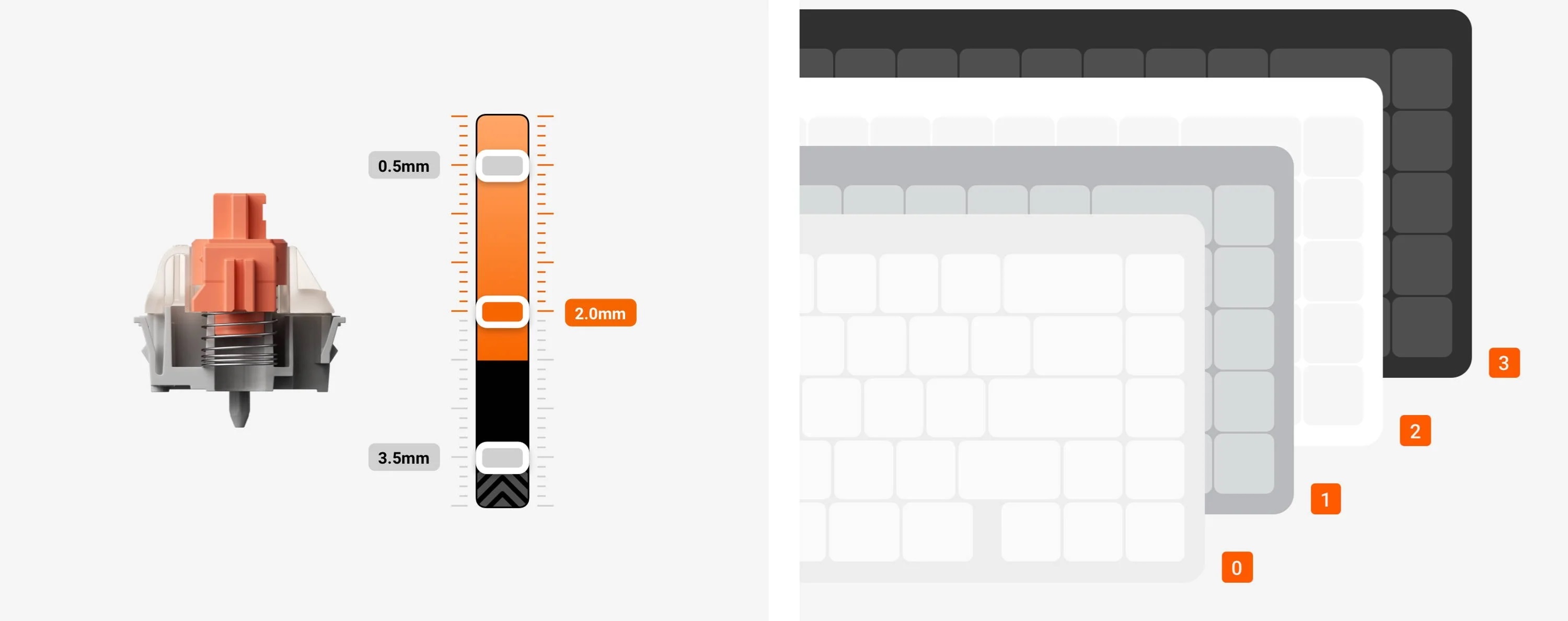 Seeing is Believing. For the first time, tough technical concepts like the dead zone and resolution are configurable in a visualized and animated manner. You can adjust them on the fly and perceive the difference with both your fingers and eyes, along with a bunch of other parameters. Similarly manipulable and visualized are the layers, the basic units of layout editting in modern keyboard configurators, up to 12 of which are supported, with each mode having 4.