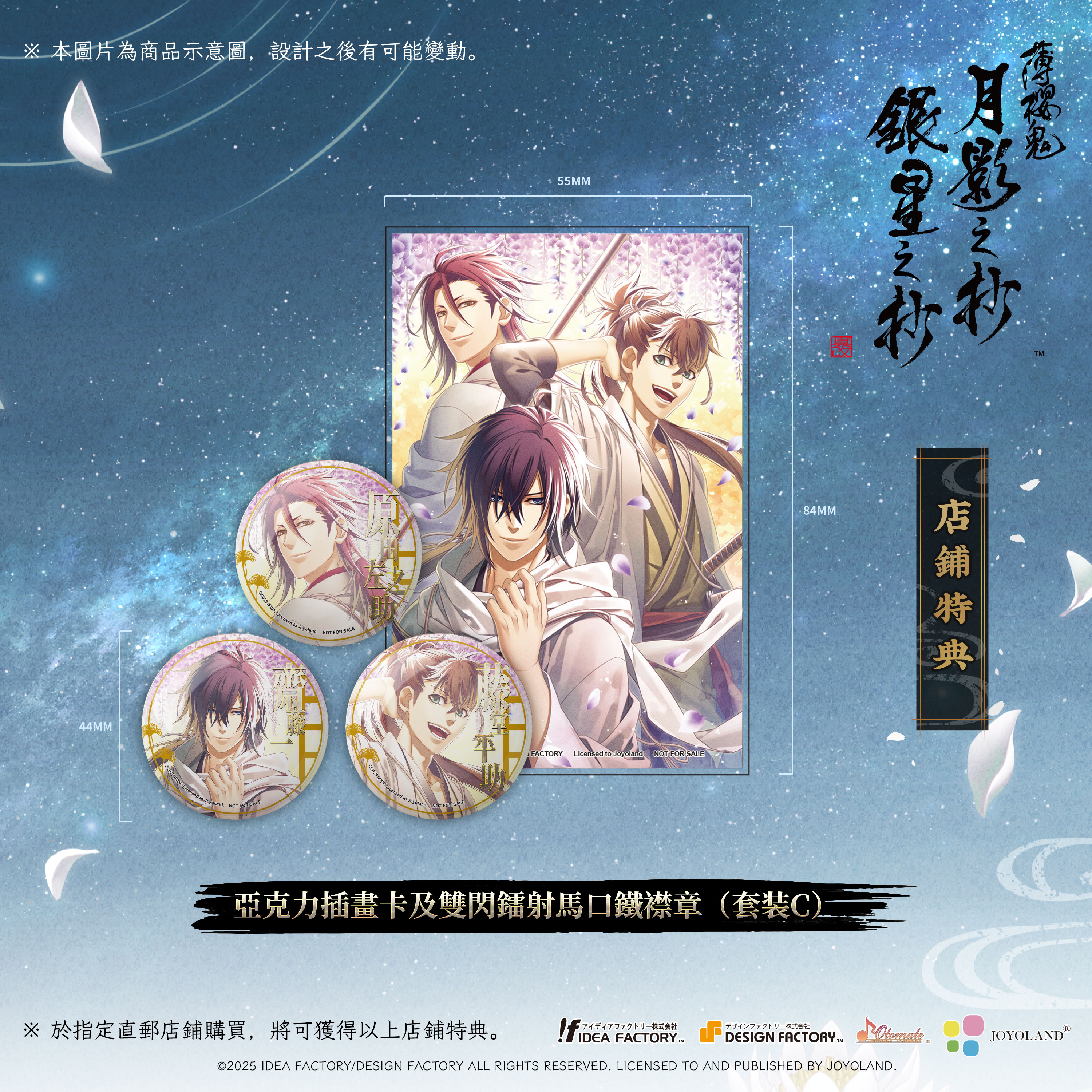- 亞克力插畫卡(1張)及馬口鐵襟章(3枚)套裝C套 齋藤 一、藤堂 平助、原田 左之助 銀星之抄KV Ver.