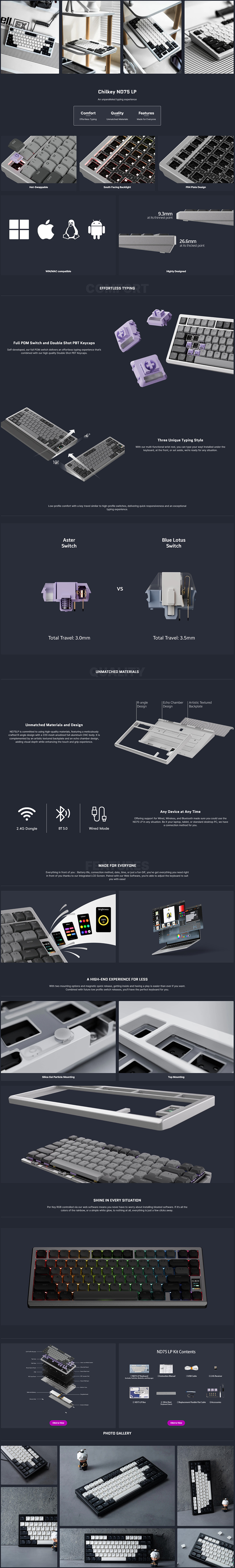 材質與設計:採用Low Profile設計,CNC 鋁合金外殼,提供 6.5° 的打字角度,有多種顏色可選(純白、純黑,淺藍、銀色、奶茶色、薰衣草色)。