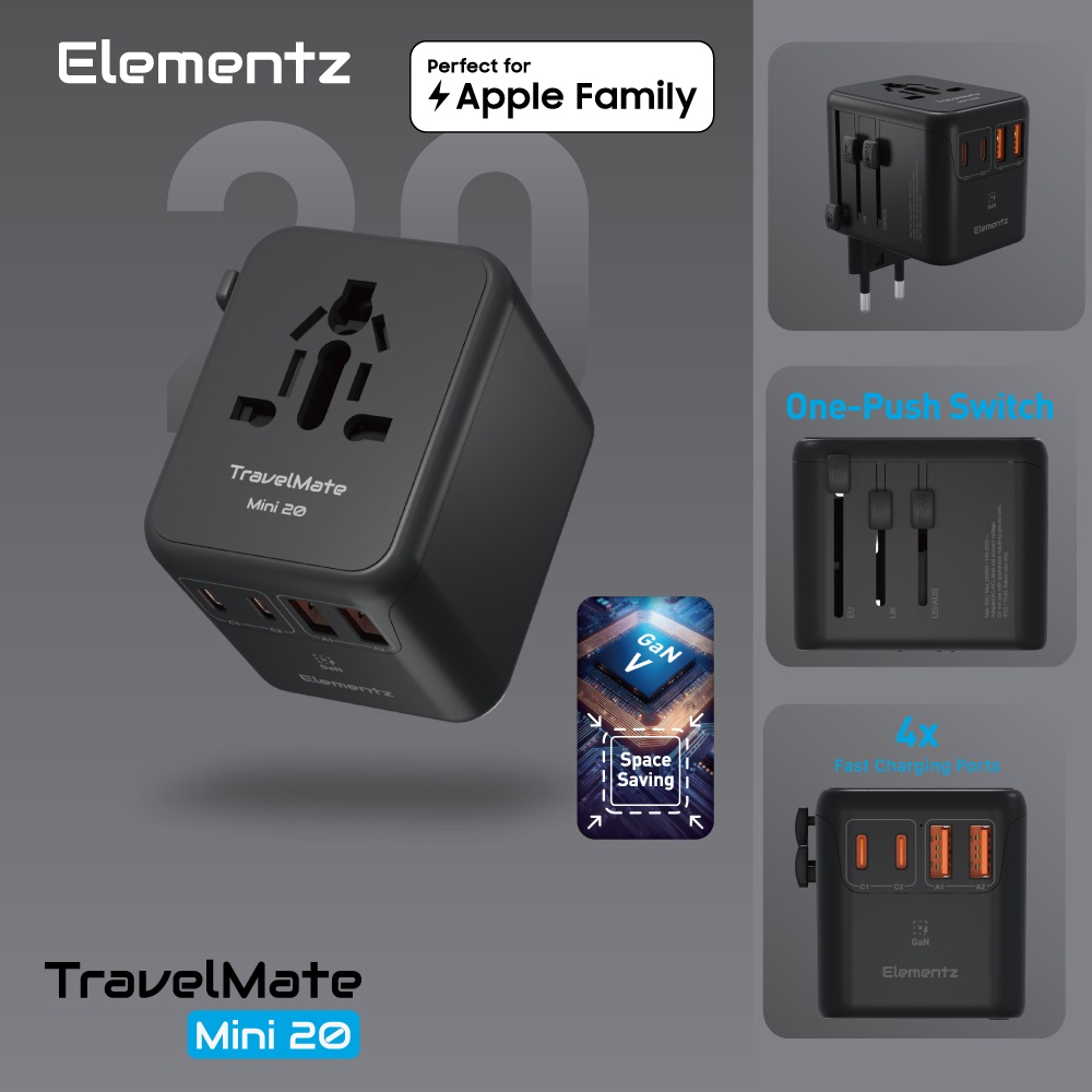 - USB C x 2 + USB-A x 2, 20W 總輸出最大功率, 可為多個設備充電。