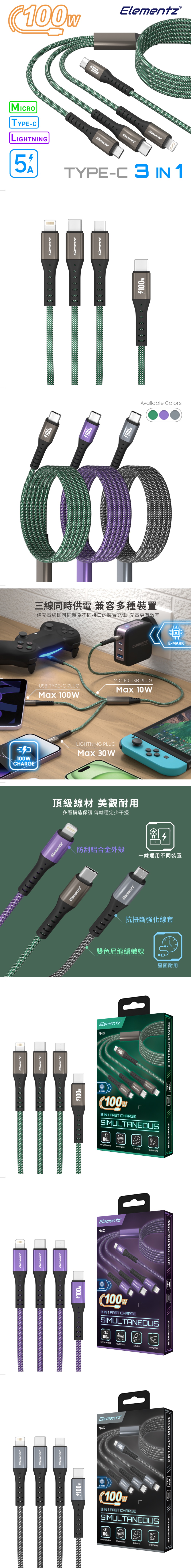 - 全新三合一, 可同時充三個設備, 援最大100W 一條線便可完成