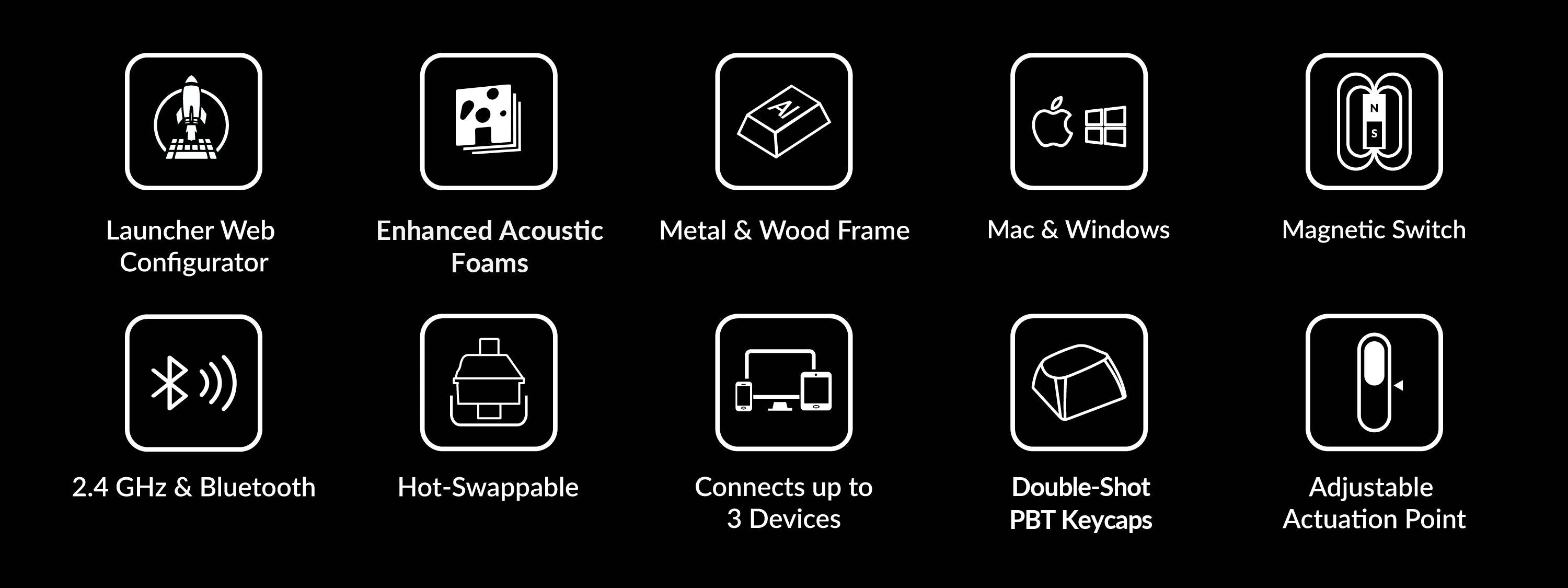 A fully customizable 100% layout wireless keyboard with magnetic switches — a breakthrough in switch technology, which—instead of physical contacts—uses magnetic sensors to measure actuation depth, putting you in total control over the response of each and every switch.