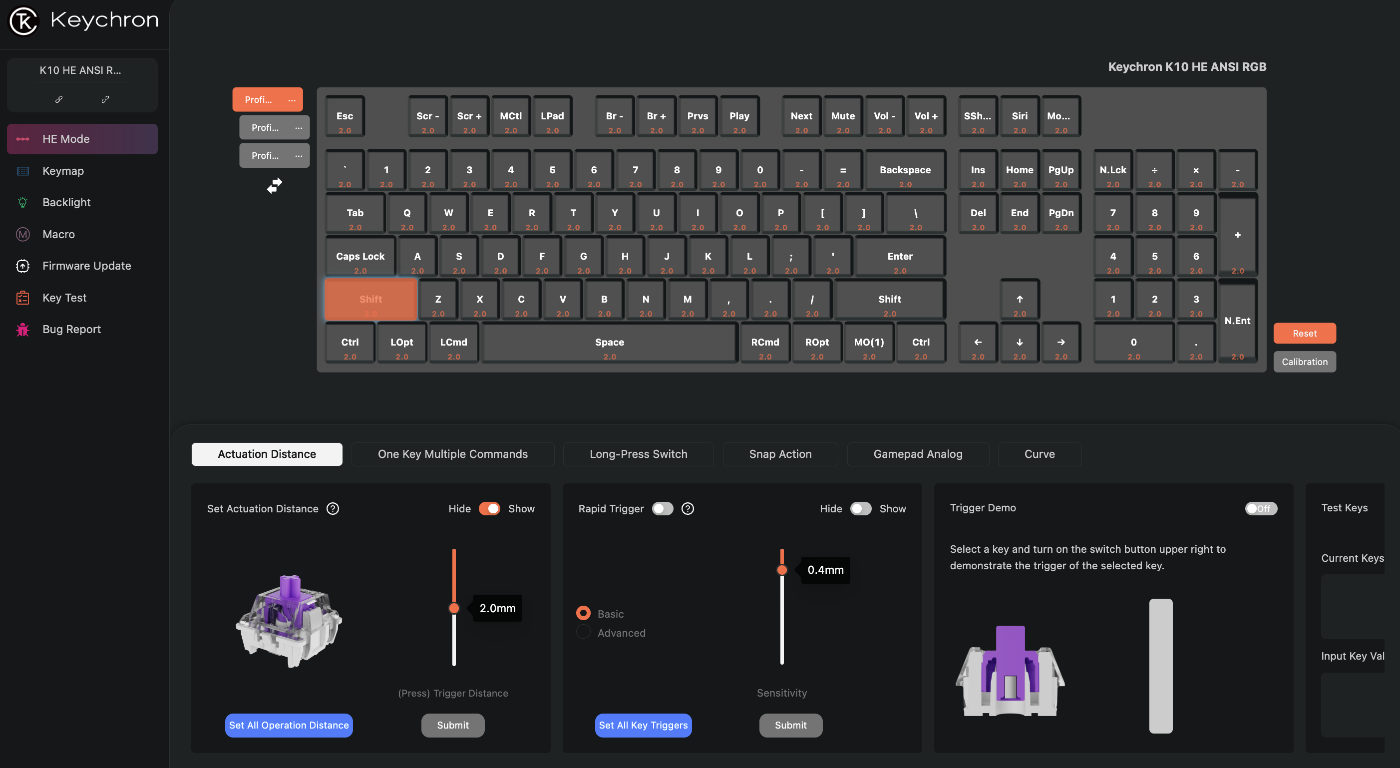Analog ModeExperience the power of Analog Mode on your K10 HE, bringing game controller-like precision to your keyboard. This mode enables variable inputs instead of the usual on/off signals, letting you achieve more fluid and dynamic control. |