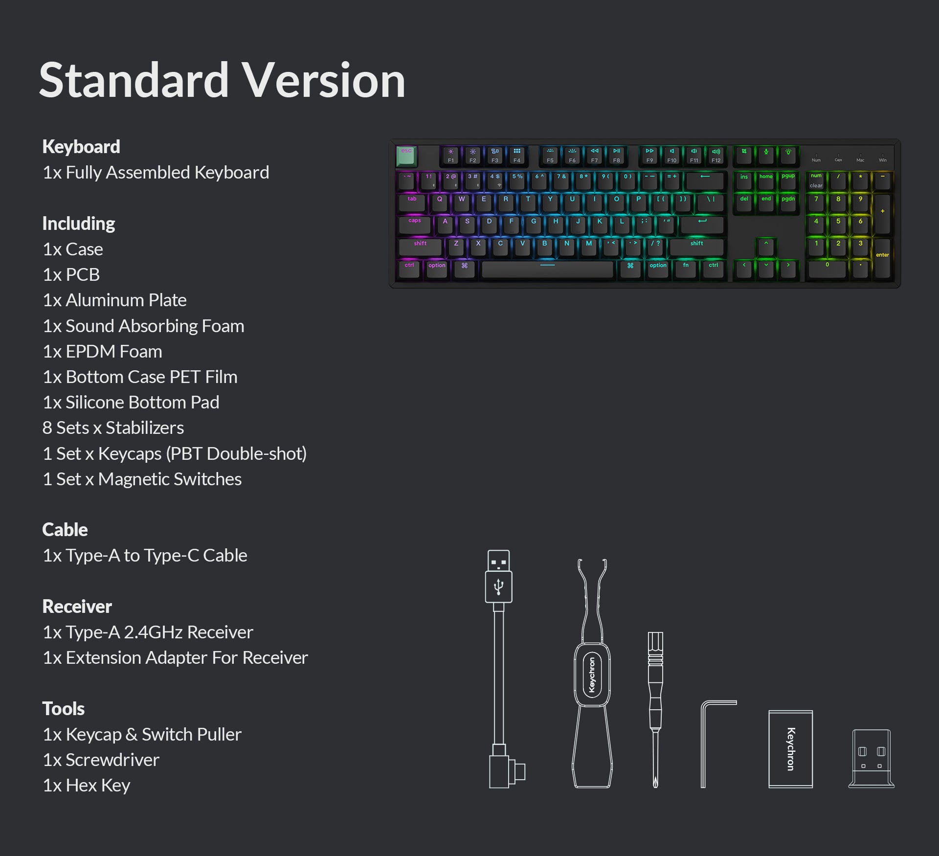 The Standard Version features Cherry profile double-shot shine-through PBT keycaps and aluminum frames.