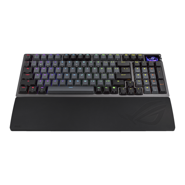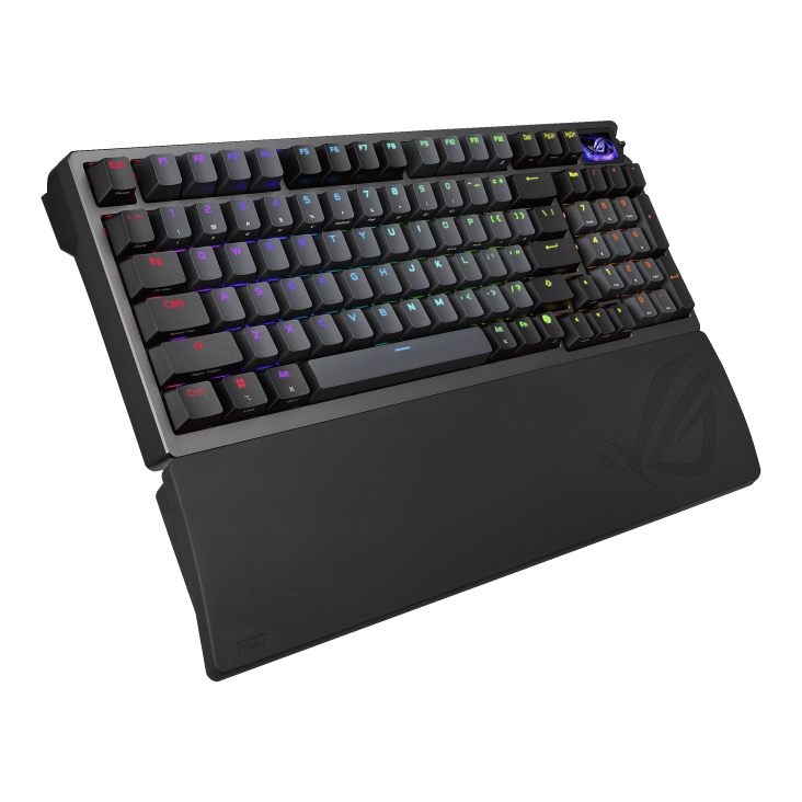 ROG Azoth 96 HE 類比遊戲鍵盤,配備可熱插拔 ROG HFX V2 磁性開關及 ROG 霍爾感測器;具備 OLED 顯示螢幕、三向旋鈕、三模連接支援 ROG SpeedNova 8K 無線技術、區域模式、六層減震設計以及可拆卸矽膠手腕托。
