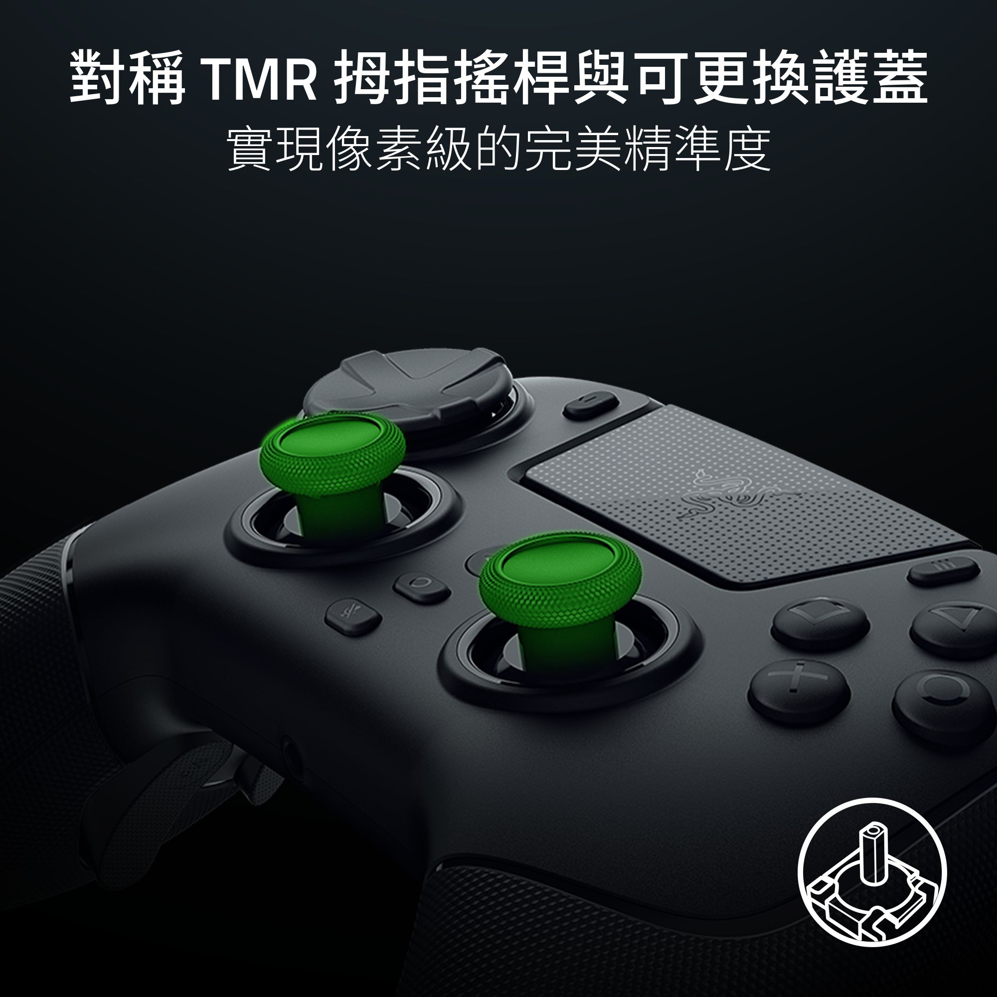 - ● 對稱式 TMR 拇指搖桿,附可更換搖桿帽