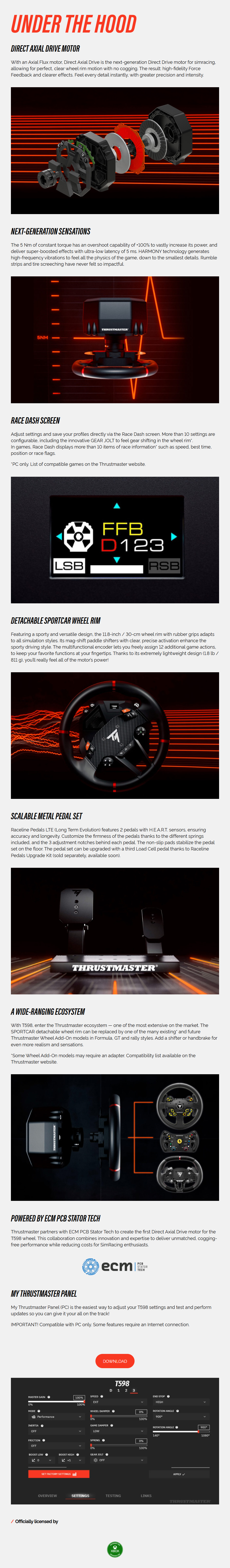 前所未有的賽車快感,盡在 T598 及其直軸驅動馬達:新一代直驅技術。此馬達提供流暢清晰的方向盤運動,無齒感,帶來高擬真力回饋。
