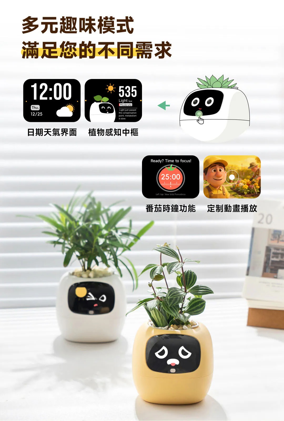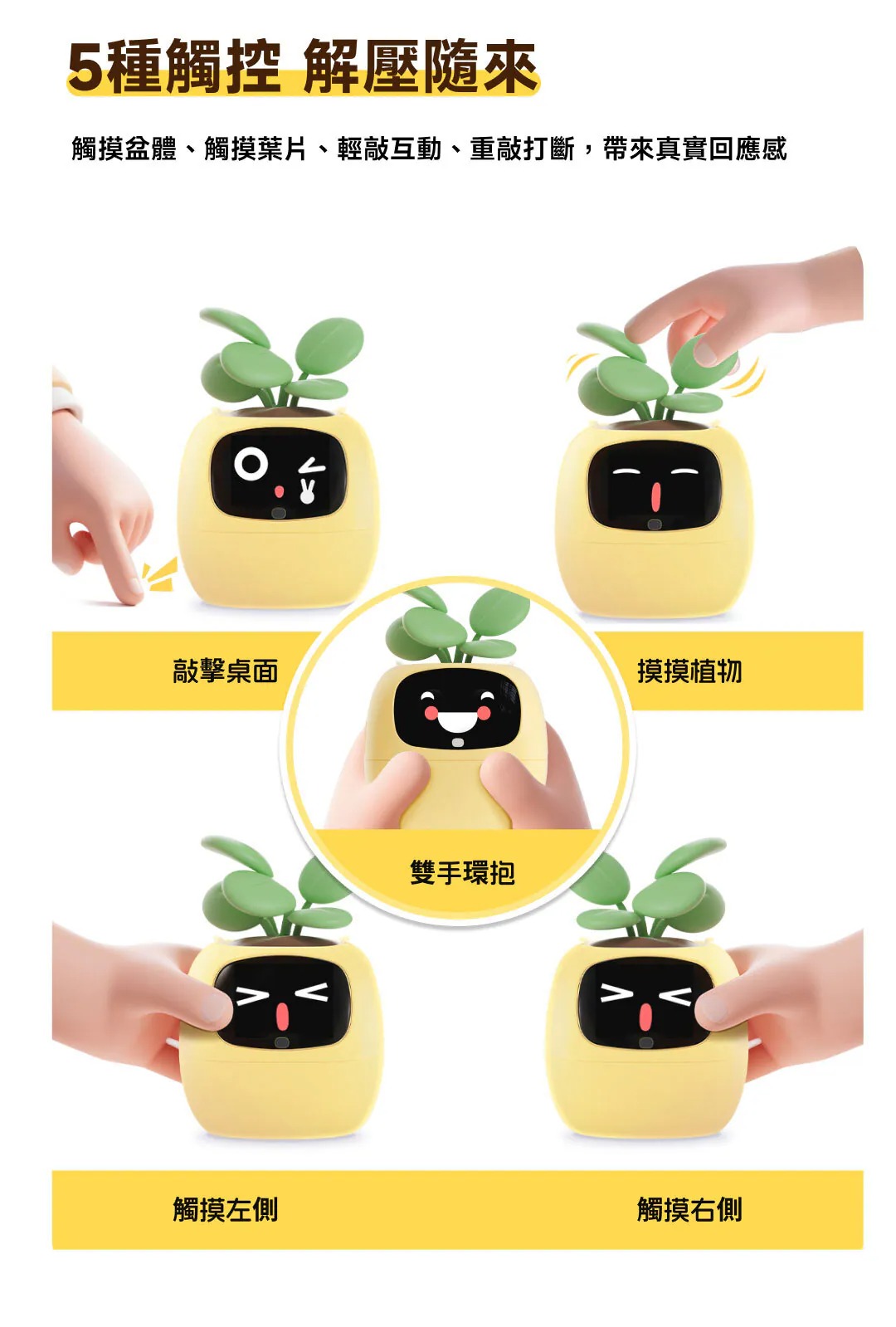 • 互動功能:具備5種觸控傳感,用戶可以透過觸摸葉子等方式與其互動,增強情感連結,使其像寵物一樣有趣。