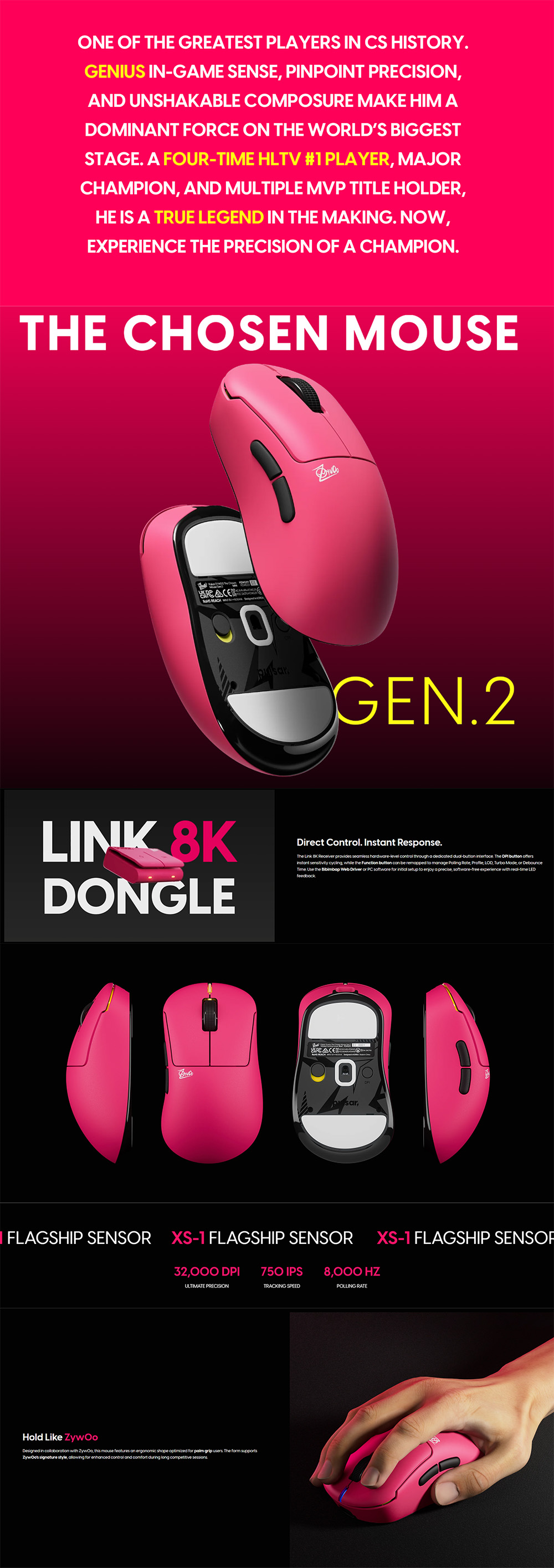 ZywOo The Chosen Mouse Gen.2 是我們合作的下一步,展現他精準冷靜的風格。搭載光學微動,點擊更銳利一致,並配合 Link 8K 接收器,即時調校效能。外觀採用 ZywOo 標誌性的亮粉色,每個細節皆為競技舞台上的絕對信心而設。