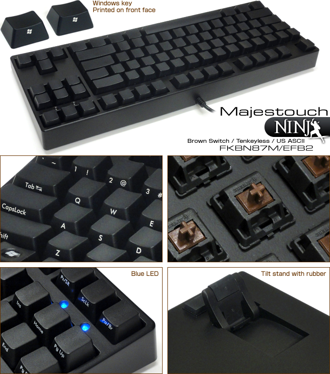 Majestouch NINJA是一台全部印字於前方的機械式鍵盤。使用者以外的角度看此鍵盤時就如同是無刻印一般的簡潔;這與目前鍵盤的印字方式完全不同, 手指不會直接接觸到印字,字也不會因為經常摩擦而造成印字變薄或是掉字等問題。再者,為了配合整台鍵盤的完整性,LED旁的印字也取消了,使得整台鍵盤更優雅大方。此設計也是非常適合給打字非常有自信無需印字的高手使用。