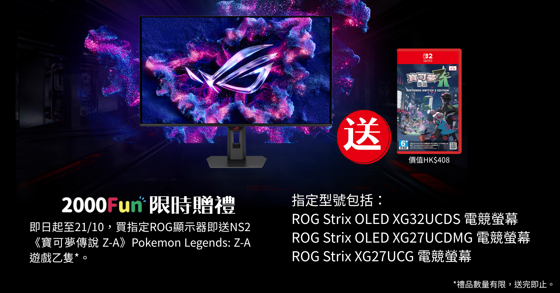 【限時贈禮】即日起至21/10,買指定ROG顯示器即送NS2《寶可夢傳說 Z-A》Pokemon Legends: Z-A 遊戲乙隻,數量有限,送完即止。