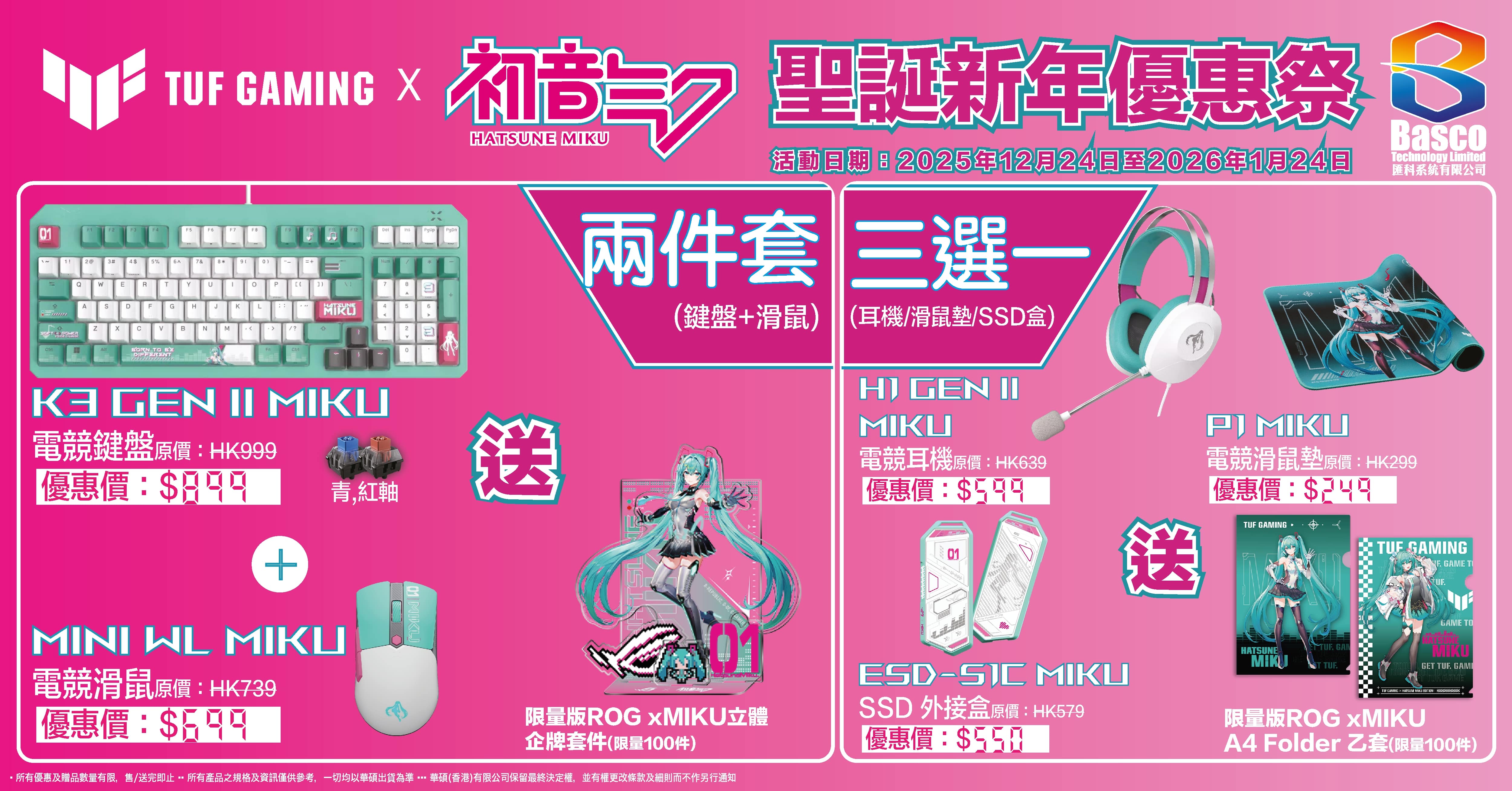凡購買任何初音鍵盤 + 滑鼠即送「限定版 ROG x MIKU 立體企牌套件」數量有限,送完即止。