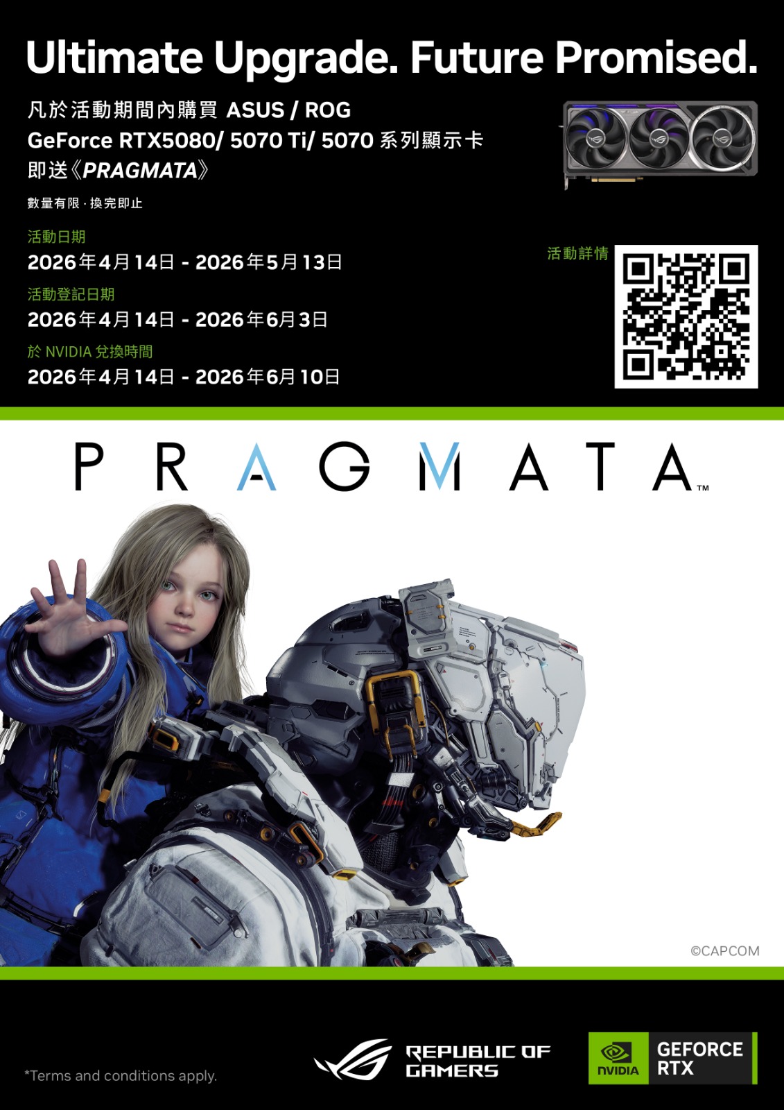 於活動期間內購買ASUS/ROG GeForce RTX5080/5070 Ti/5070系列顯示卡,即送《PRAGMATA》。數量有限,換完即止。