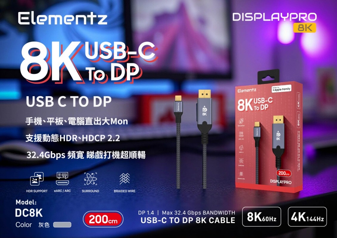 【熱賣款】Elementz 8K Type C to DP/HDMI 影音傳輸線(DC8K200/HC8K200建議零售價$138/$198