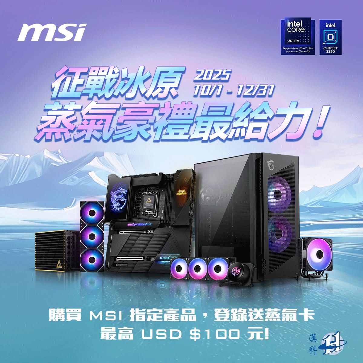 即日起參加 MSI「征戰冰原 蒸氣豪禮最給力」 年度促銷活動,不僅能盡情體驗旗艦級硬體性能,更可獲得免費 Steam 點數,盡情暢遊虛擬世界。 活動期間自 2025 年 10 月 1 日至 12 月 31 日 止,凡購買 MSI 指定型號 主機板、電源供應器、機箱、水冷散熱器、風冷散熱器 或 風扇,即可免費兌換 Steam 蒸氣卡遊戲儲值金,價值 US$10 至 US$100 不等,讓玩家一次滿足效能升級與娛樂享受。