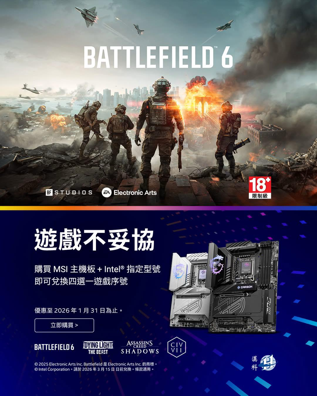 購買指定型號 MSI Z890/B860 主機板任一款 + INTEL CORE ULTRA 2 處理器, 就可以到 MSI 官方網站登記, 即可換領以下四款遊戲大作嘅其中一款 — 包括《戰地風雲™ 6》、《刺客教條:暗影者》、《文明帝國VII》或《消逝的光芒:困獸》!活動加碼再送串流、俐作工具及遊戲內 DLC 優惠。
