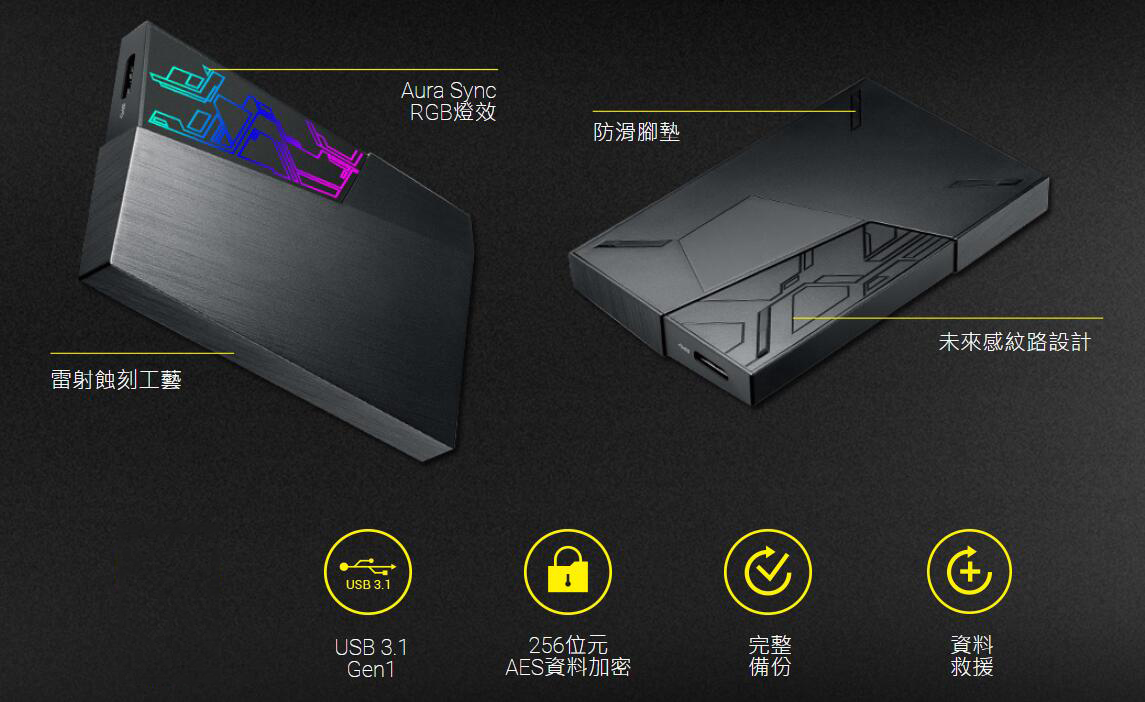 ASUS FX 是世界上首款搭載 Aura Sync 燈效技術的2.5吋外接式硬碟,配備USB 3.1 Gen1 數據傳輸、256位元 AES資料加密並提供 1 TB 或 2 TB的容量選擇,以實現極其可靠的備份解決方案。 採用極富未來感的外觀設計和獨特的Aura Sync LED 燈效同步,ASUS FX 讓所有電競配備都煥然一新。