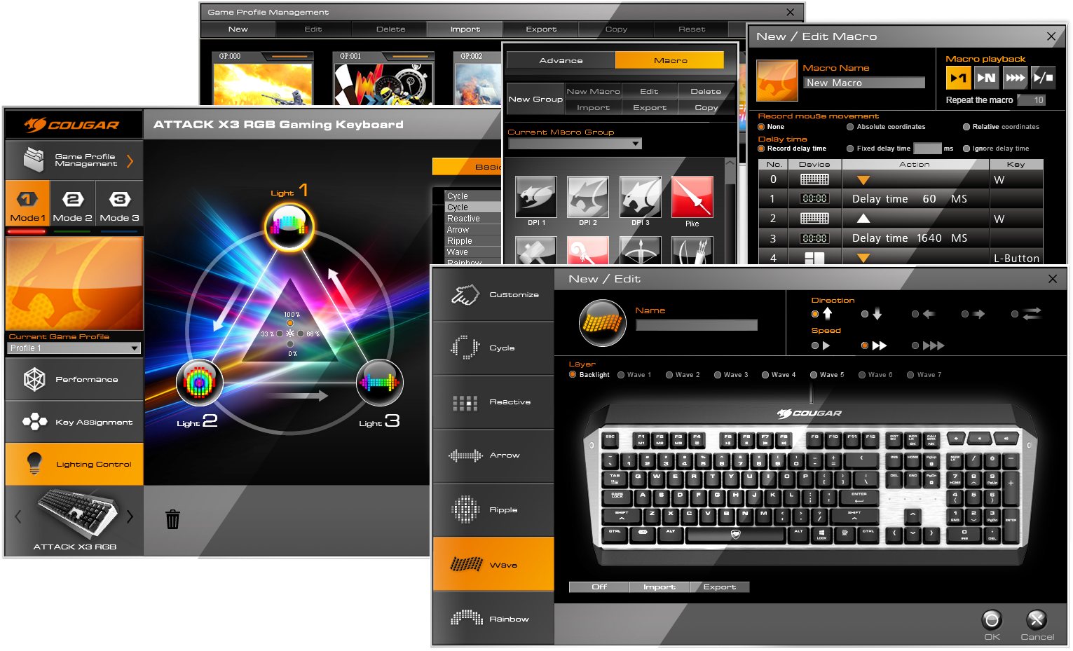 COUGAR UIX系統用有最直覺、最友善、與極簡易的介面,可讓您編輯無限種類的背光效果。此外,簡單易上手的介面設計能協助你輕鬆進行個人化喜好設定、巨集設定,還可在 COUGAR 產品間進行分享與同步,UIX 軟體具備所有玩家需的調整功能,等您來體驗。