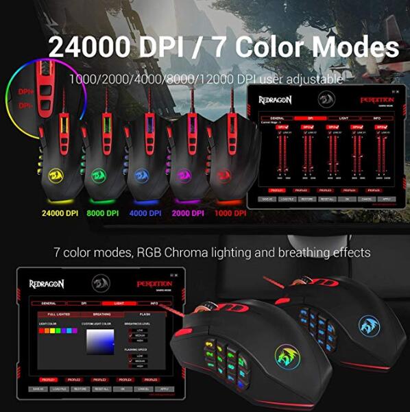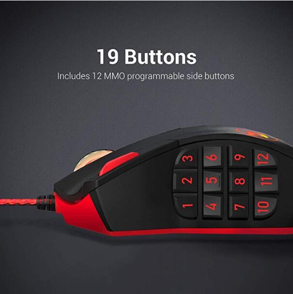 高端PCGAMING MOUSE功能; Redragon M901鼠標具有6個標準鼠標按鈕,配有12個MMO可編程側按鈕。共18個按鈕。電源按鈕,脈衝呼吸燈顏色模式。耐用的光滑TEFLON腳墊可實現終極遊戲控制。鼠標可與Redragon Gaming鍵盤配合使用。配有6英尺3毫米強力高速編織光纖電纜和鍍金無腐蝕USB連接器,可實現可靠連接。