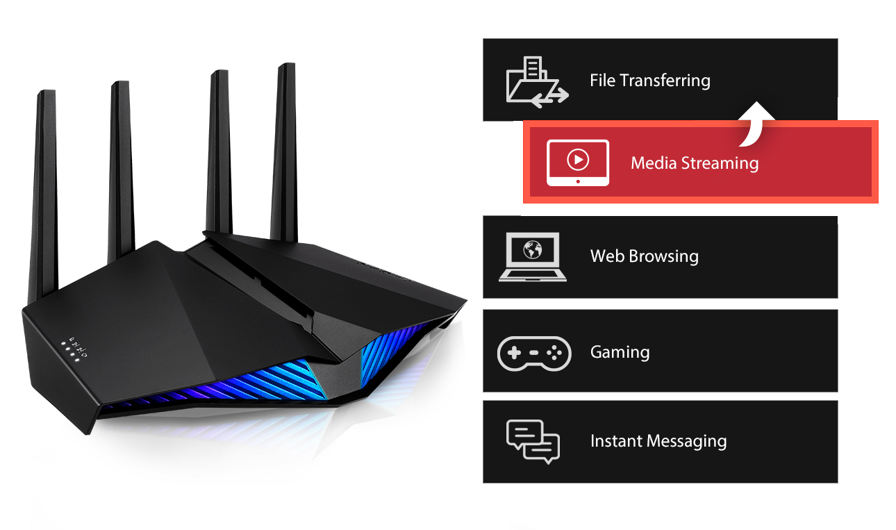 使用 ASUS RT-AX82U 雙頻 WiFi 6 路由器享受前所未有最快速流暢的 WiFi 遊戲連線。它提供高達 5400 Mbps* 的超快 WiFi 速度,並包含多項先進技術,包括手機遊戲模式,可提供毫無遲滯且低延遲的手機遊戲體驗。