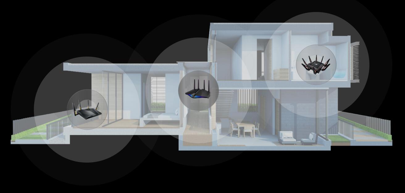您的路由器是否有 WiFi 訊號死角?RT-AX82U 支援 ASUS AiMesh,這項獨特的網狀網路技術可利用多部 ASUS 路由器建立全住宅網路。它提供簡單的集中式控制和無接縫的漫遊功能,非專業人士也能利用自有的任何 AiMesh 路由器完成設定。告別 WiFi 訊號死角!