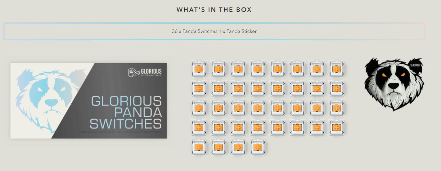 Glorious Panda 取原始熊貓軸之精華,去其槽粕,採用世界各地的優良部件組合而成,帶來熱刀入牛油般順滑鍵程,明確而圓潤的段落觸感和天籟般鍵擊聲響。Glorious Panda 有明快靈動的觸感,擁有比一般類茶軸機械軸更高更強烈的段落點、更迅速的回彈鍵程。比起坊間的Holy Panda軸,可以明顯感受到Glorious Panda有更快到達的段落點、更順滑的行程和更快的回彈反饋。