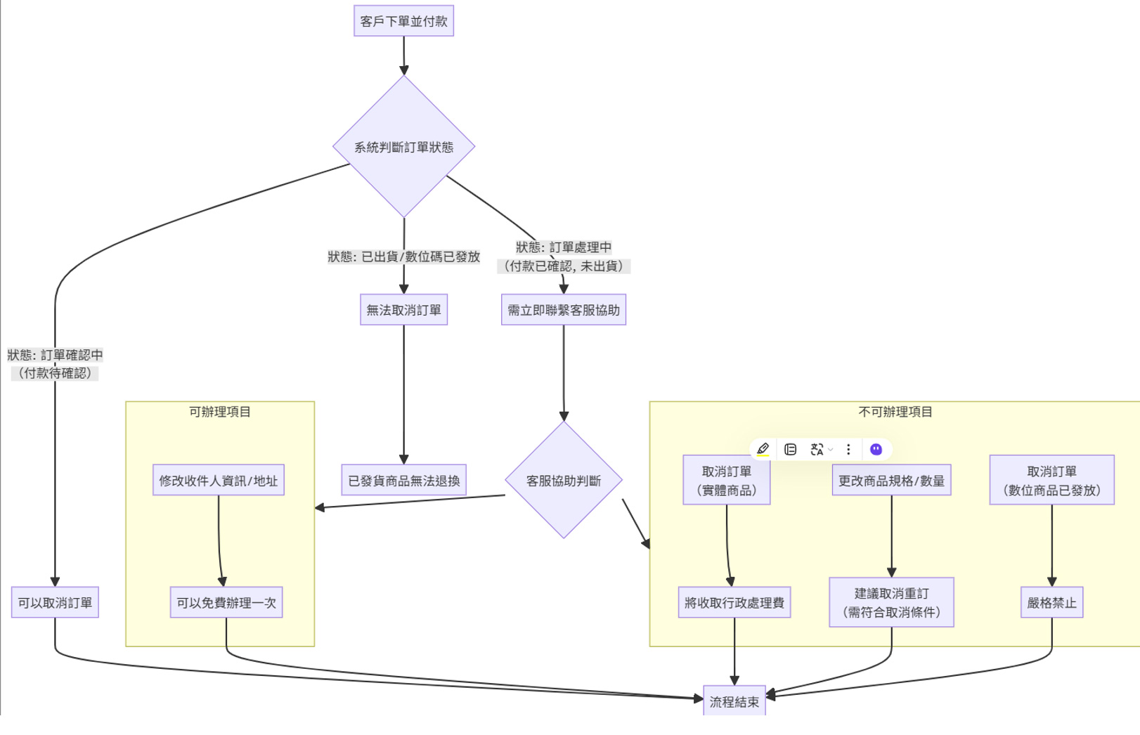 - 3.1. 訂單一經成立,即進入我們的系統處理流程。能否修改或取消,取決於訂單的當前狀態;